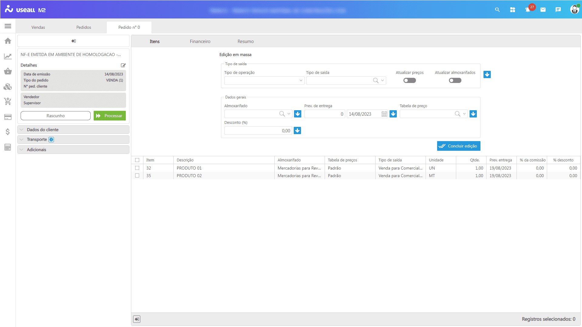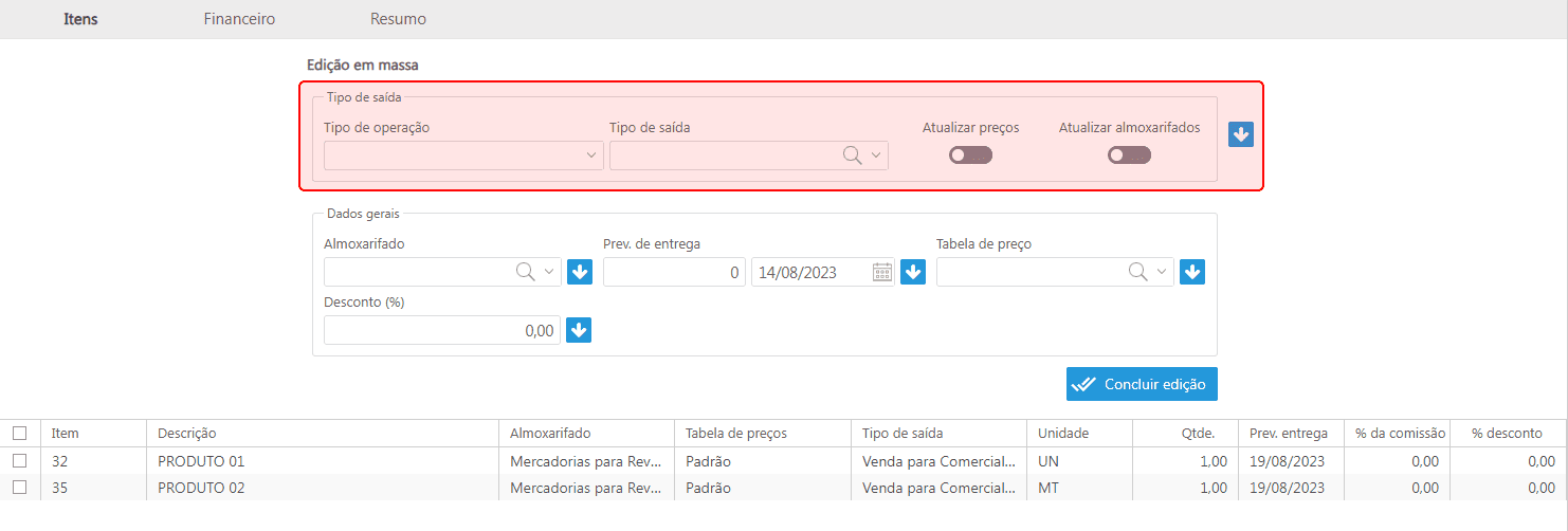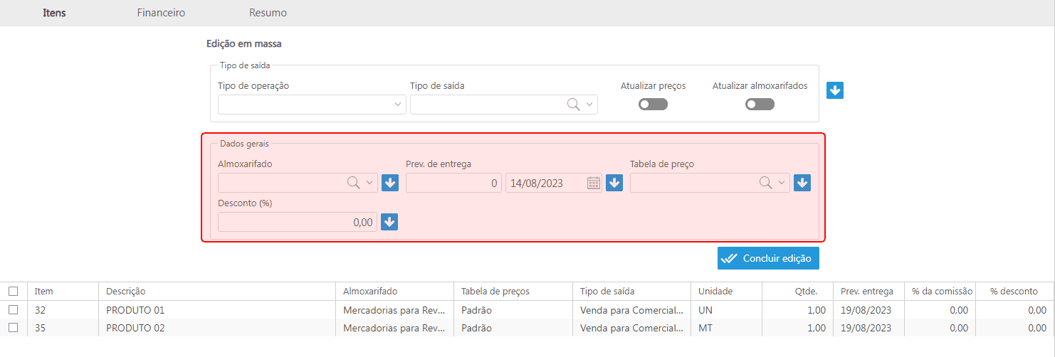 Na Edição em massa é possível realizar a edição de algumas informações para vários itens do pedido.