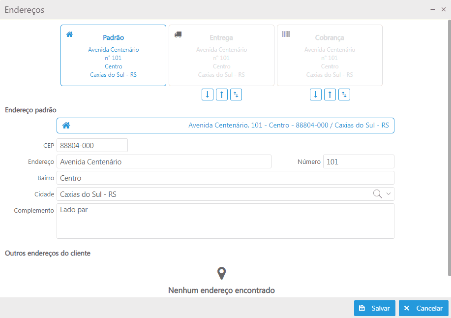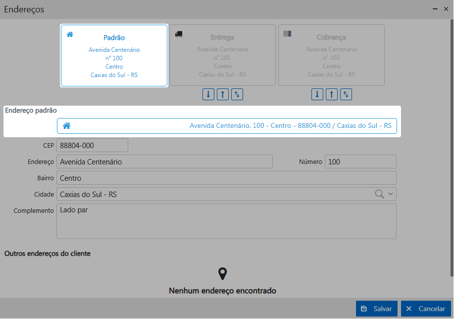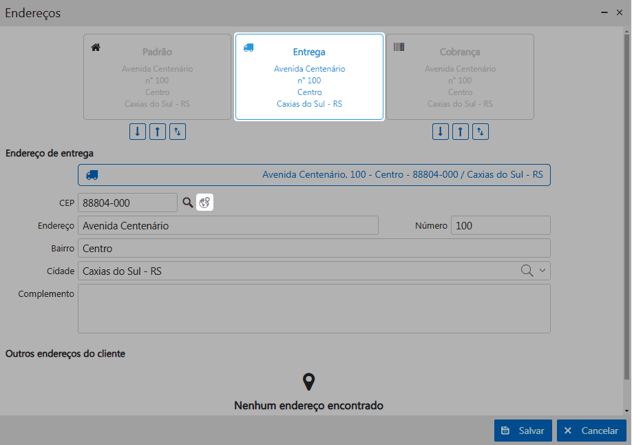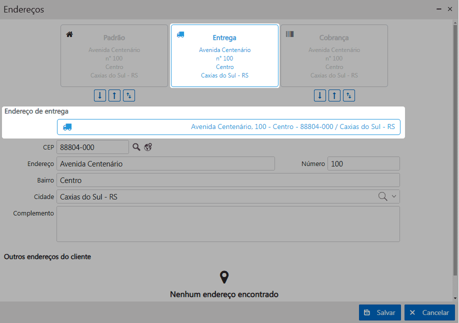A opção de Outros endereços do cliente, funciona com a parametrização Configurações local dos clientes. Esta opção pode ser utilizada este endereço quando o pedido precisar ser entregue num outro endereço do cliente, sendo que essa opção é esporádica, então aplica-se o uso do endereço Local.