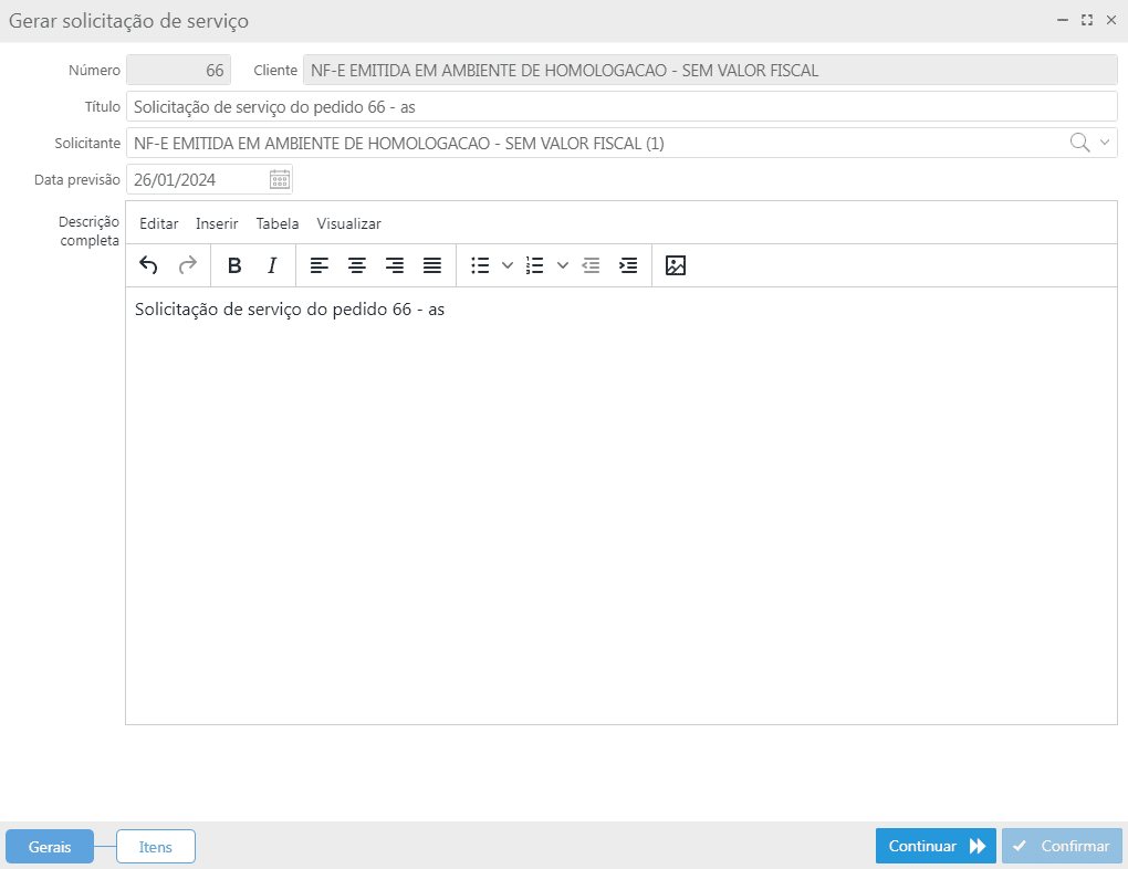 Nesta tela é possível criar a solicitação de serviço para um pedido.