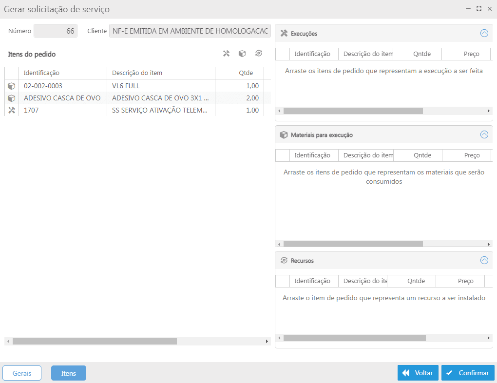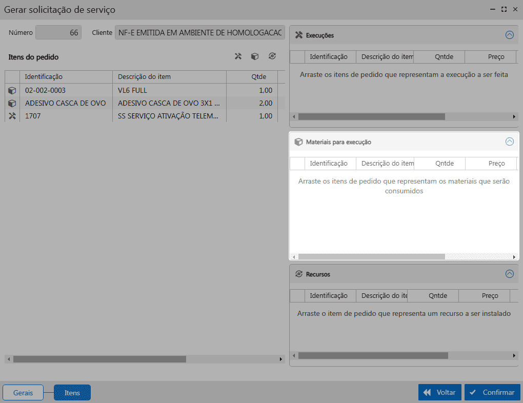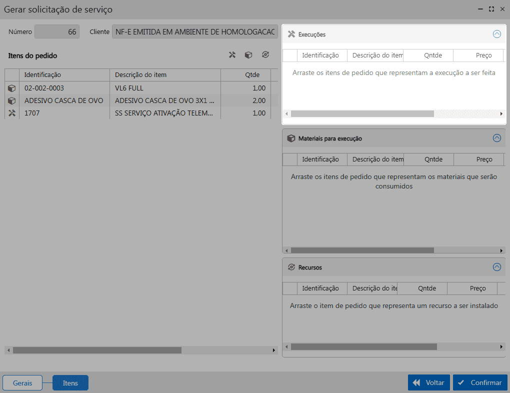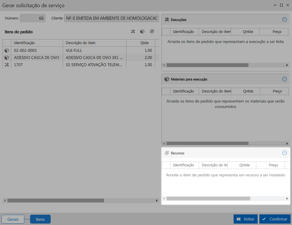 No lado esquerdo da tela tem-se a Coluna - Itens do pedido onde serão apresentados todos os itens relacionados ao pedido, sendo execuções, materiais e recursos. Cada item deve ser arrastado para o quadro correspondente.