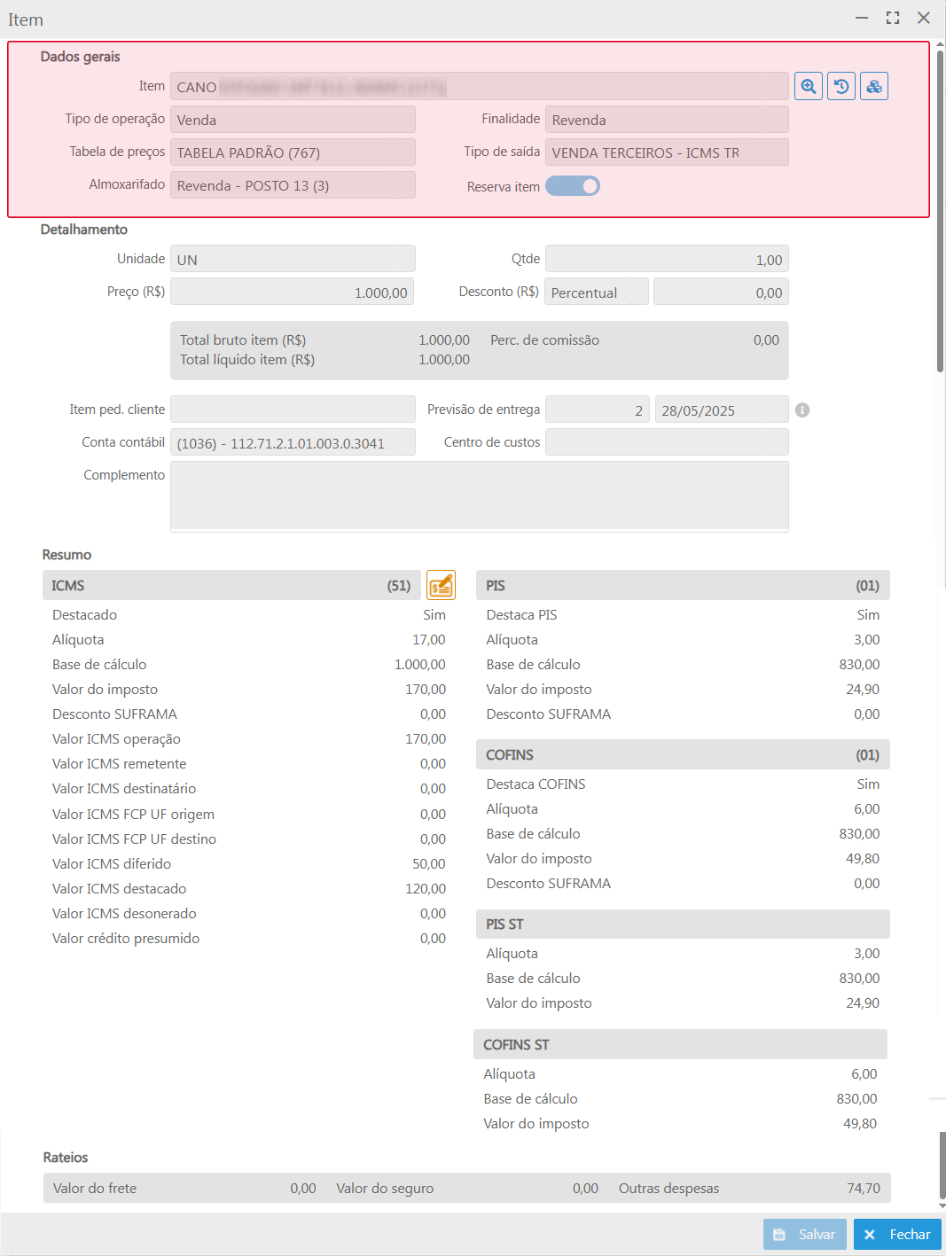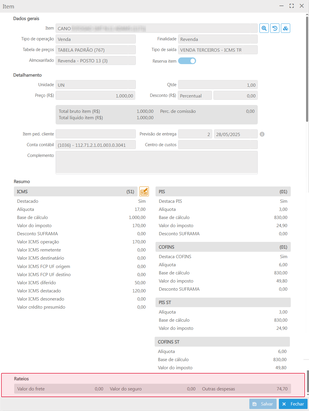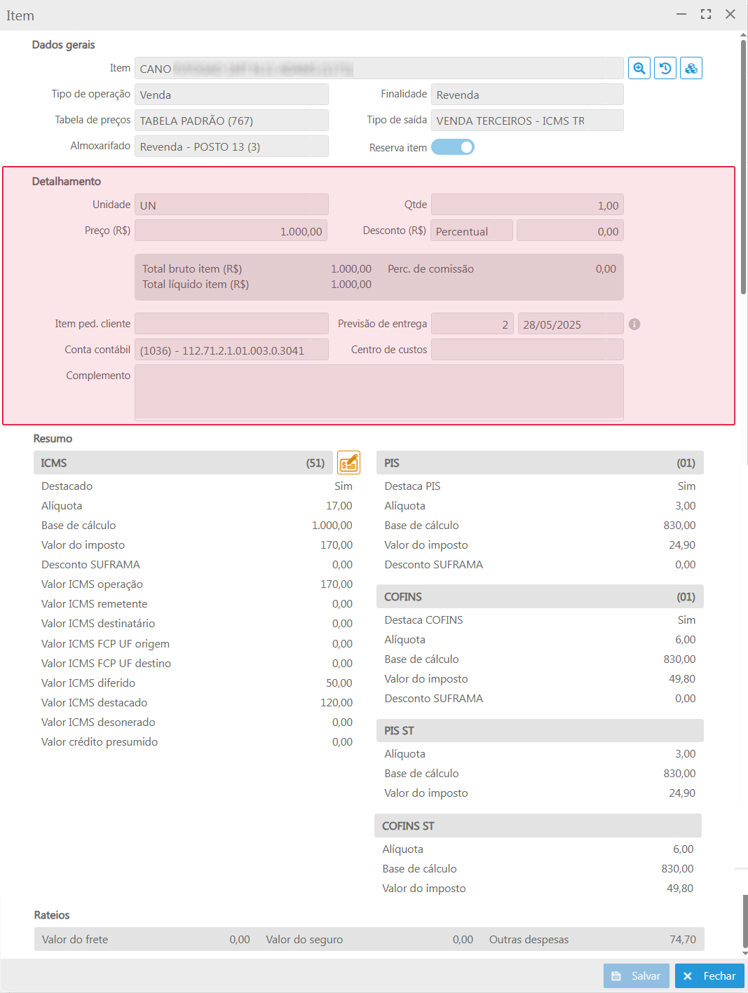 No quadro de valores é apresentando o total bruto do item, total líquido do item e o valor de comissão (quando estiver parametrizado para gerar comissão;)