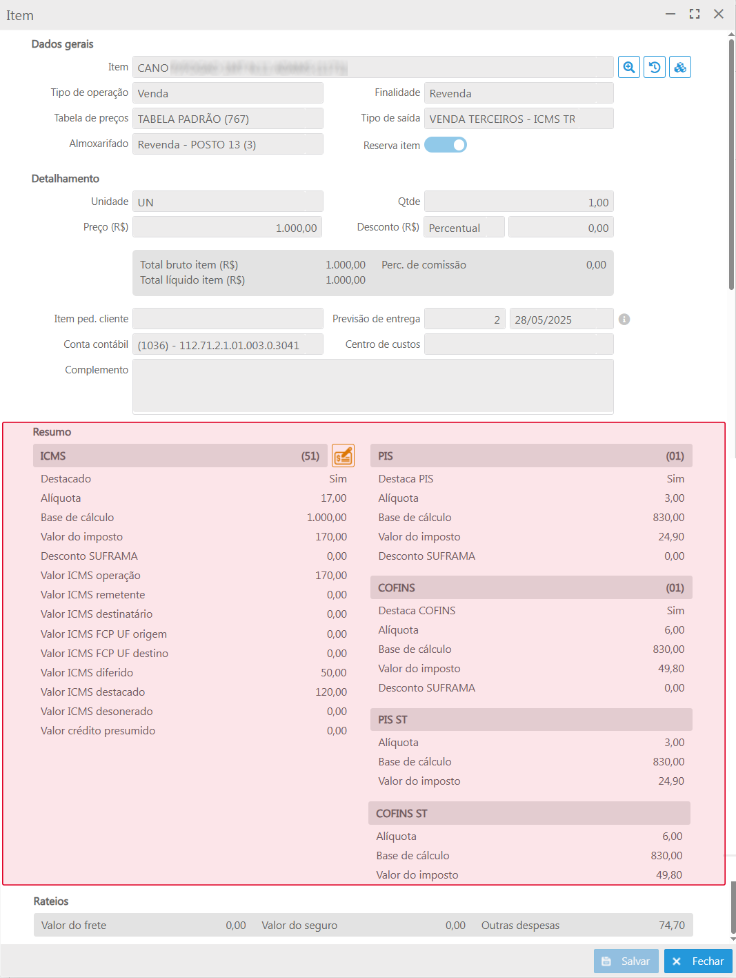 No quadro Resumo são exibidas as informações tributárias conforme o item selecionado, sendo ICMS, IPI, PIS e/ou CONFIS.