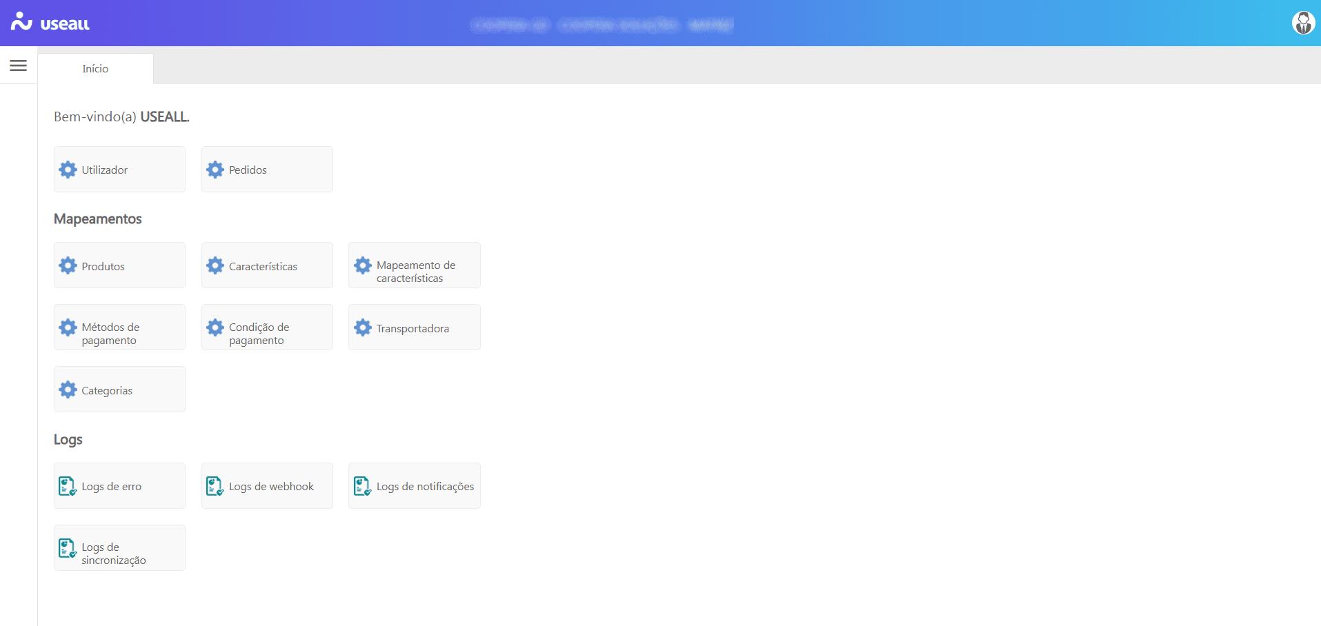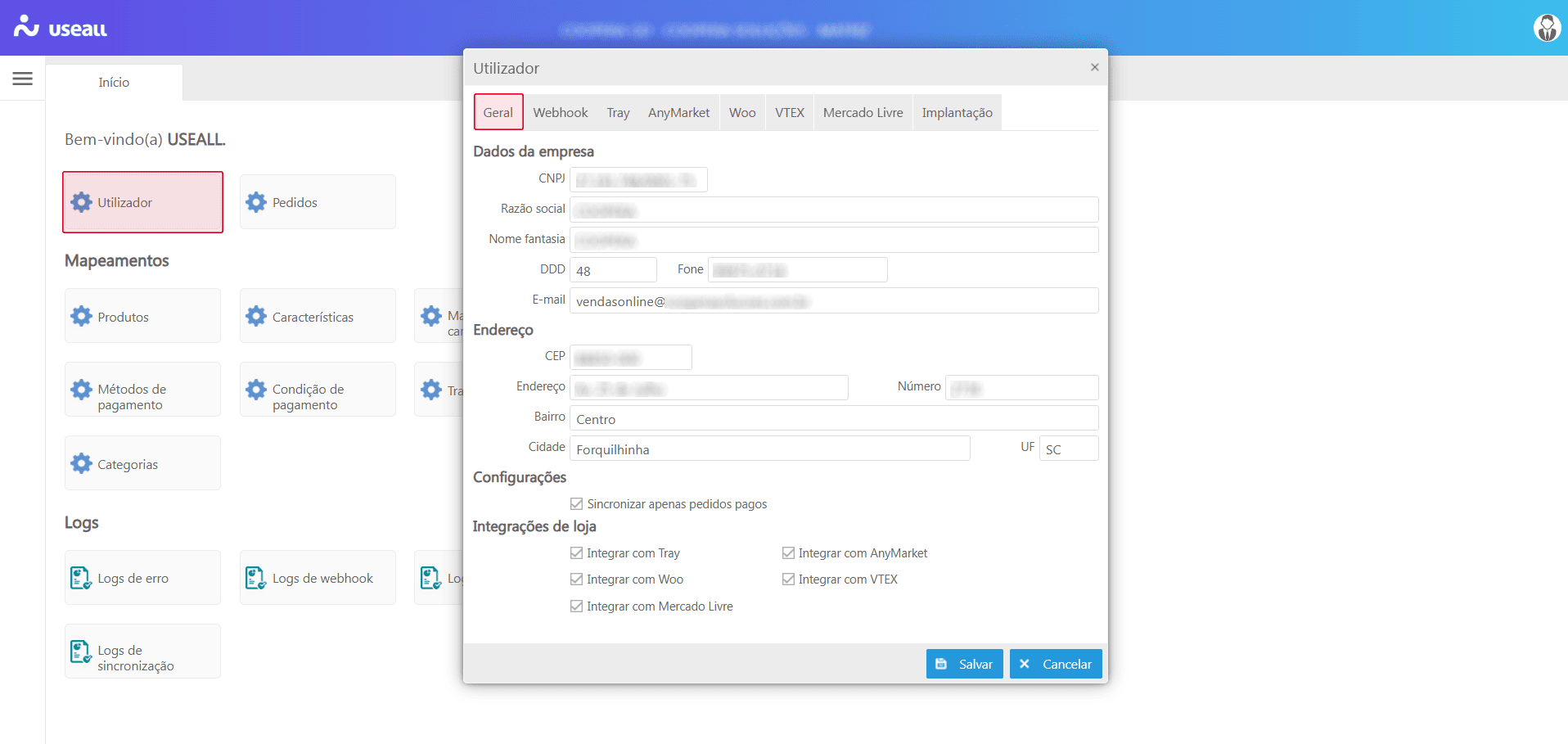 Ao clicar na tile Utilizador na aplicação Useall ecommhub - sistema M2, tem-se a tela Utilizador, sendo o cadastro principal que reúne os dados essenciais para habilitar e configurar as integrações, servindo como o ponto de partida para ativar conexões com marketplaces e plataformas de e-commerce, além de definir regras operacionais específicas para cada cliente.