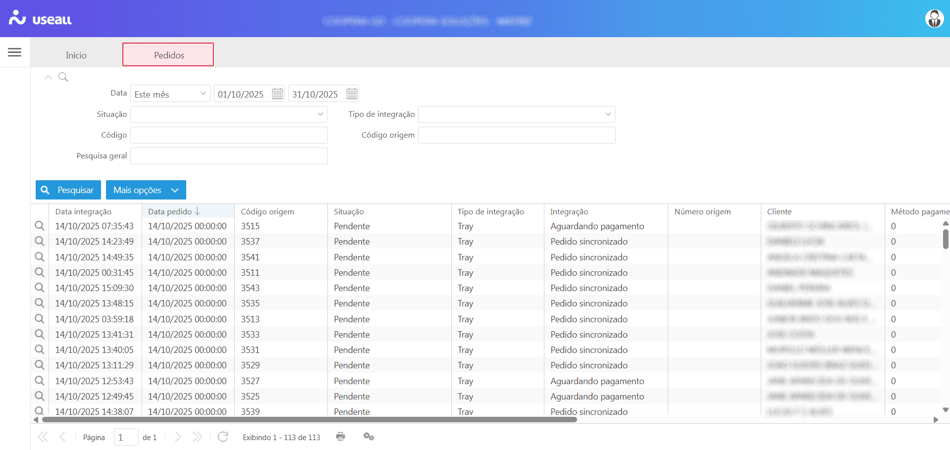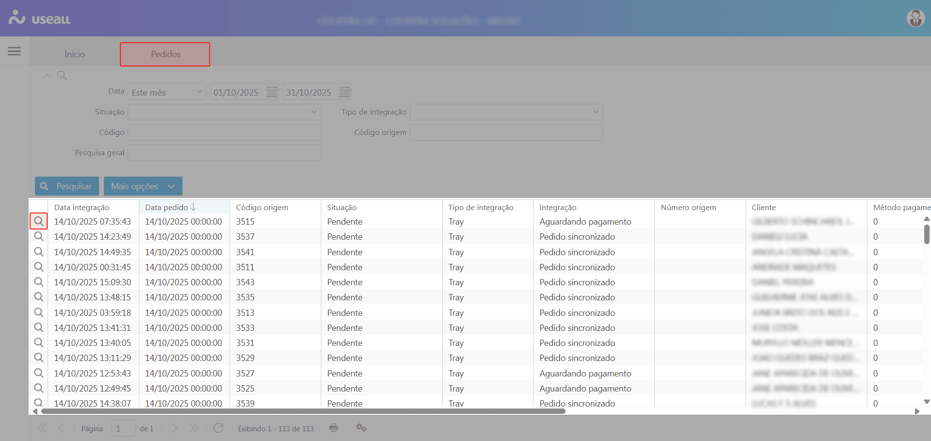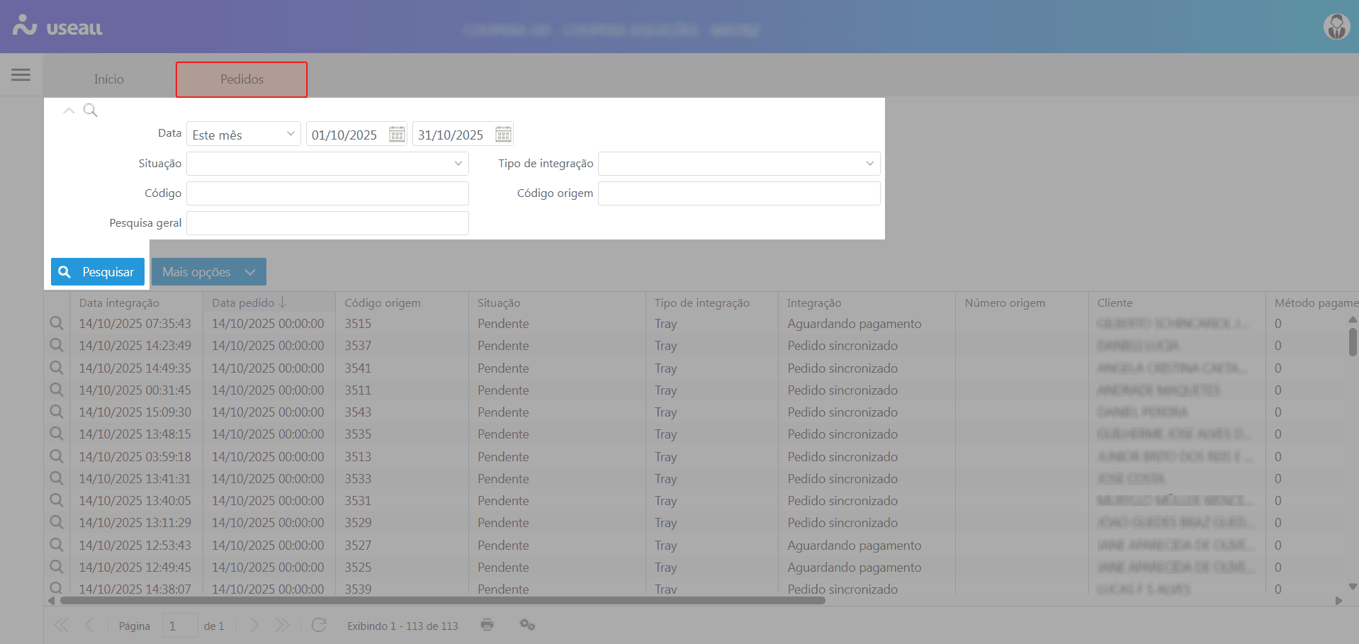 - Situação: permite filtrar por status da sincronização sendo: erro, pendente e sincronizado;