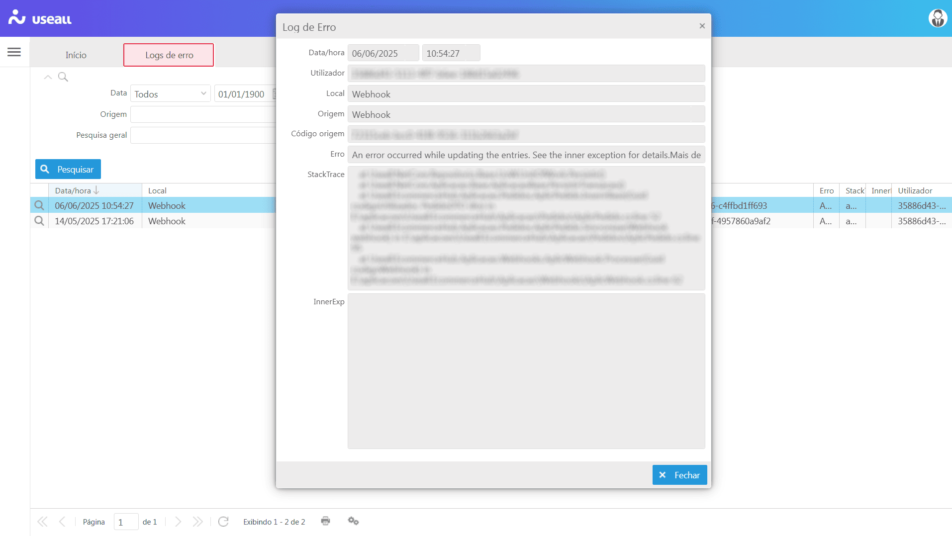 Essa tela é essencial para o suporte e análise técnica, pois permite correlacionar erros de integração com eventos específicos no sistema, ajudando na rastreabilidade e na resolução ágil de falhas.