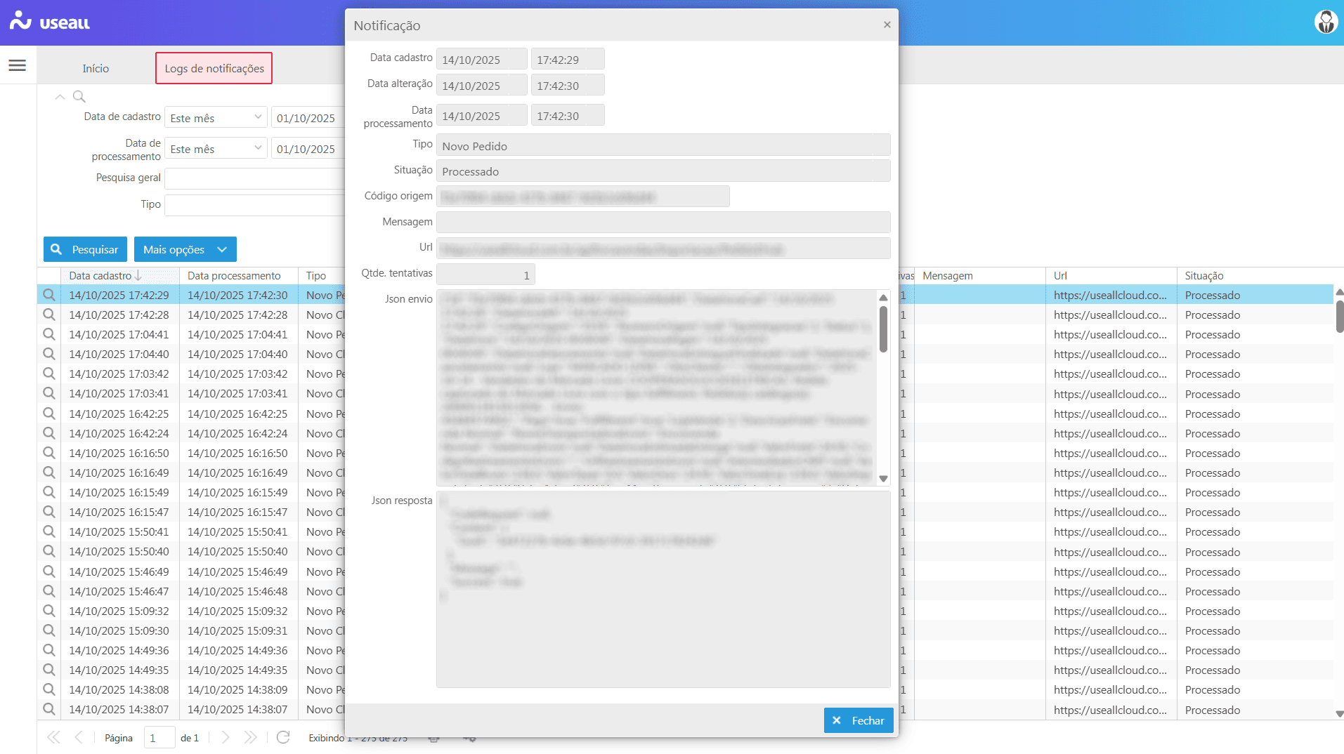 A tela Log de notificações exibe os registros de comunicação recebidos pelo sistema, geralmente vindos de integrações com marketplaces ou hubs. Seu objetivo é demonstrar se um evento (como novo pedido) foi processado com sucesso ou não, além de fornecer os detalhes técnicos do envio e resposta.