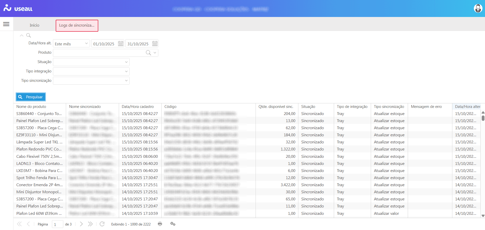 - Tipo sincronização: filtra pelo tipo de ação realizada na integração sendo: alterar imagem, atualizar ativo/inativo, atualizar estoque, atualizar produto, atualizar valor, inserir, inserir produto e remover imagem.