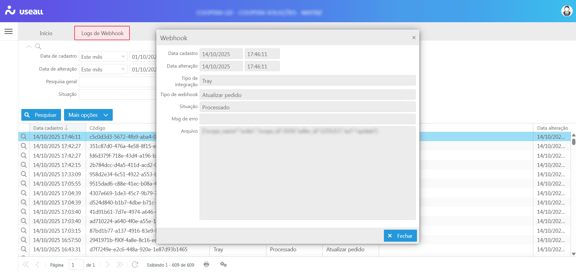 - Data de cadastro / Data de alteração: informa o momento em que o webhook foi recebido e registrado no sistema, também a última vez em que foi atualizado (normalmente logo em seguida ao processamento);