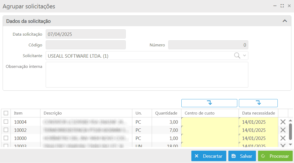 Centro de custo: oferece a opção para informar o centro de custo para os itens da solicitação. Esta opção deve ser parametrizada em Centro de custo.