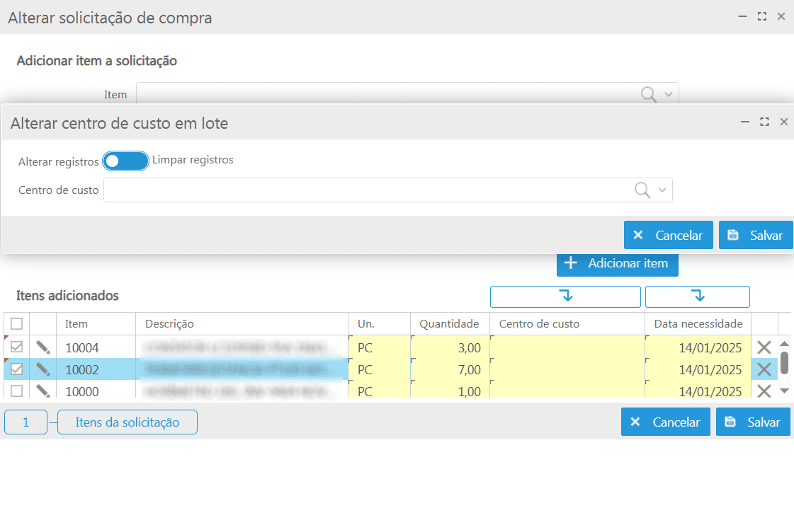 Os campos "Data necessidade" e "Centro de custos" podem ser alterados em lote, para isto, basta selecionar os registros e clicar nos botões