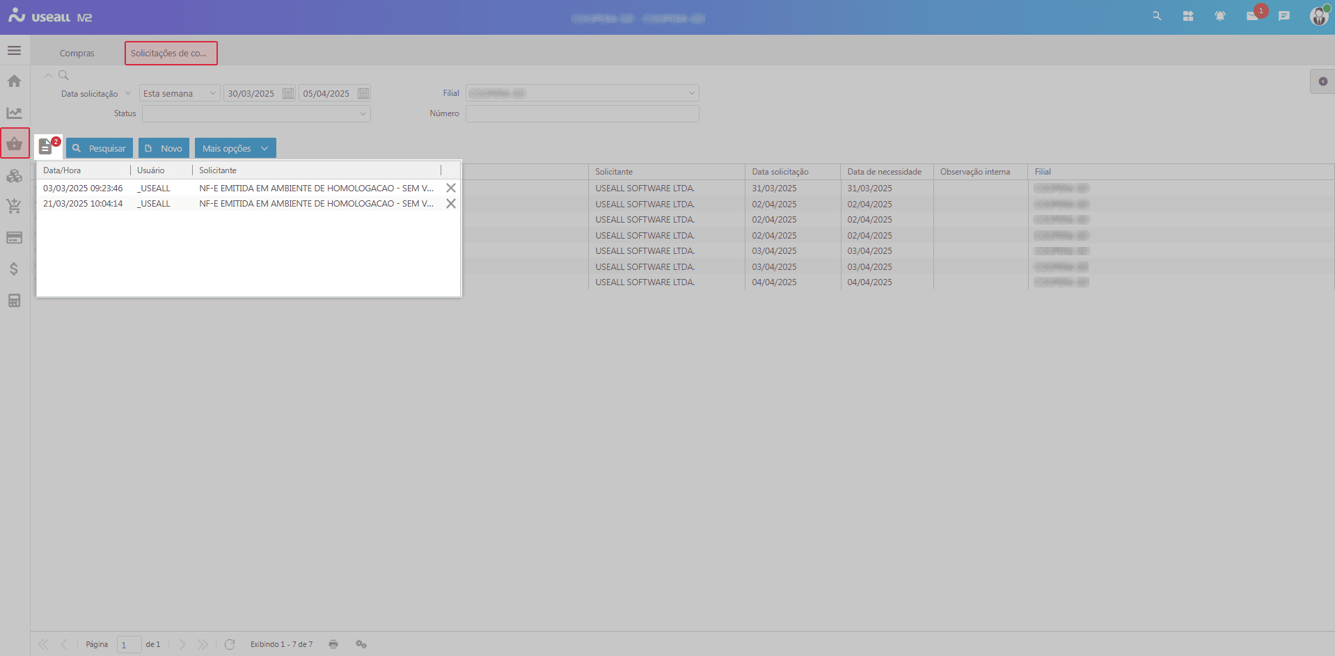 Na grid são apresentadas as solicitações de compra conforme os filtros selecionados.