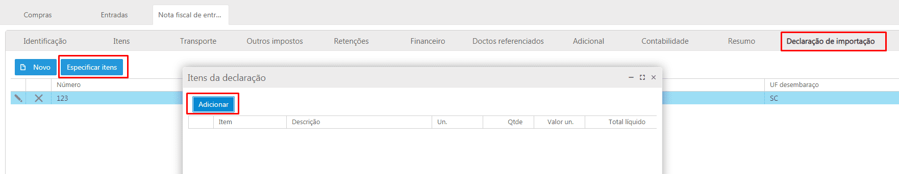 Para as notas de importação, geralmente o lançamento da DI é feita para todos os itens da nota, porém alguns fornecedores geram DI específica por item, nesse caso pode-se utilizar o botão Especificar itens sendo possível selecionar os itens informados na DI.