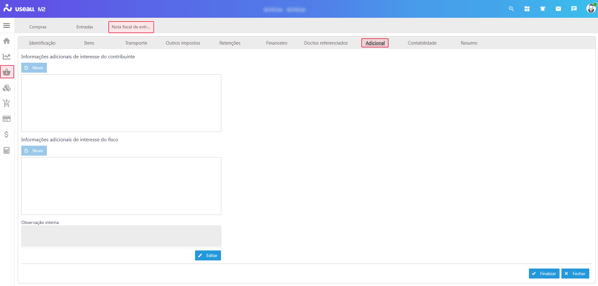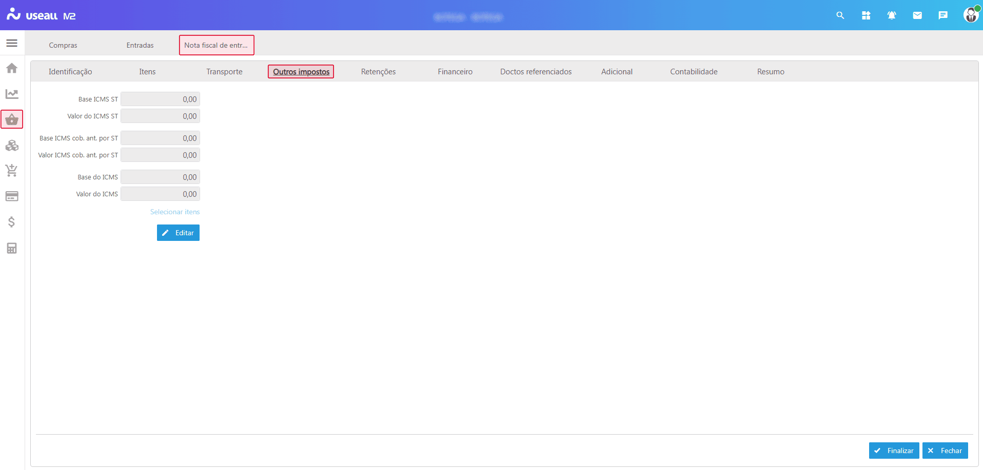 Aba Outros impostos: nesta aba são exibidos os dados referente a valores de impostos, sendo possível editá-los caso necessário;