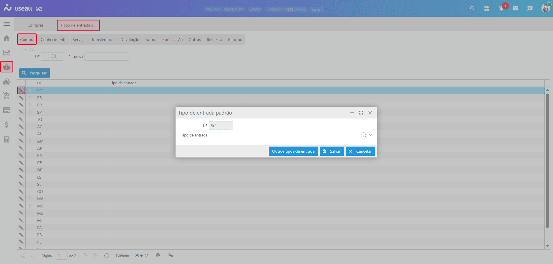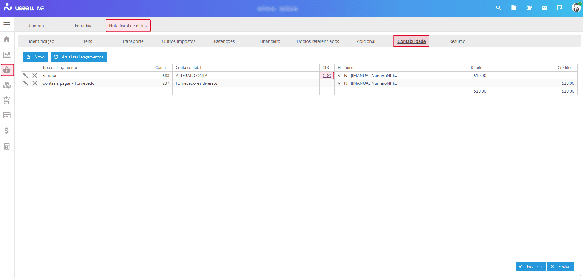Cancelar: permite efetuar o cancelamento da entrada, alterando o status do registro para "Cancelado";