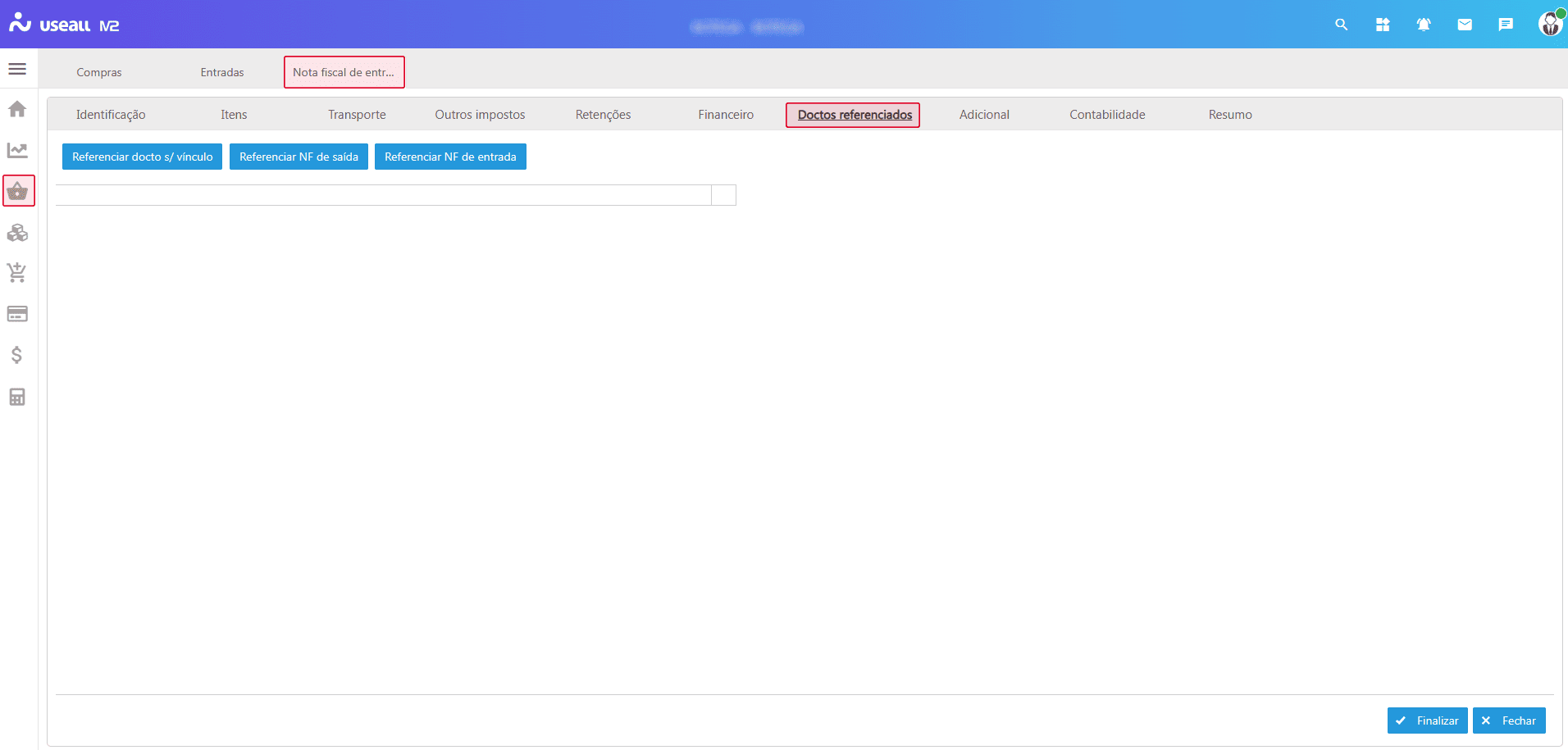 Aba Doctos referenciados: nesta aba tem-se a possibilidade de vincular documentos de nota fiscal de saída ou entrada ou documento sem vínculo. Deve-se clicar na opção desejada e efetuar o vínculo conforme necessário;