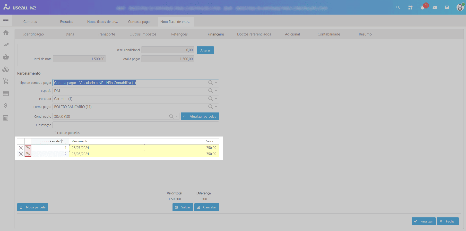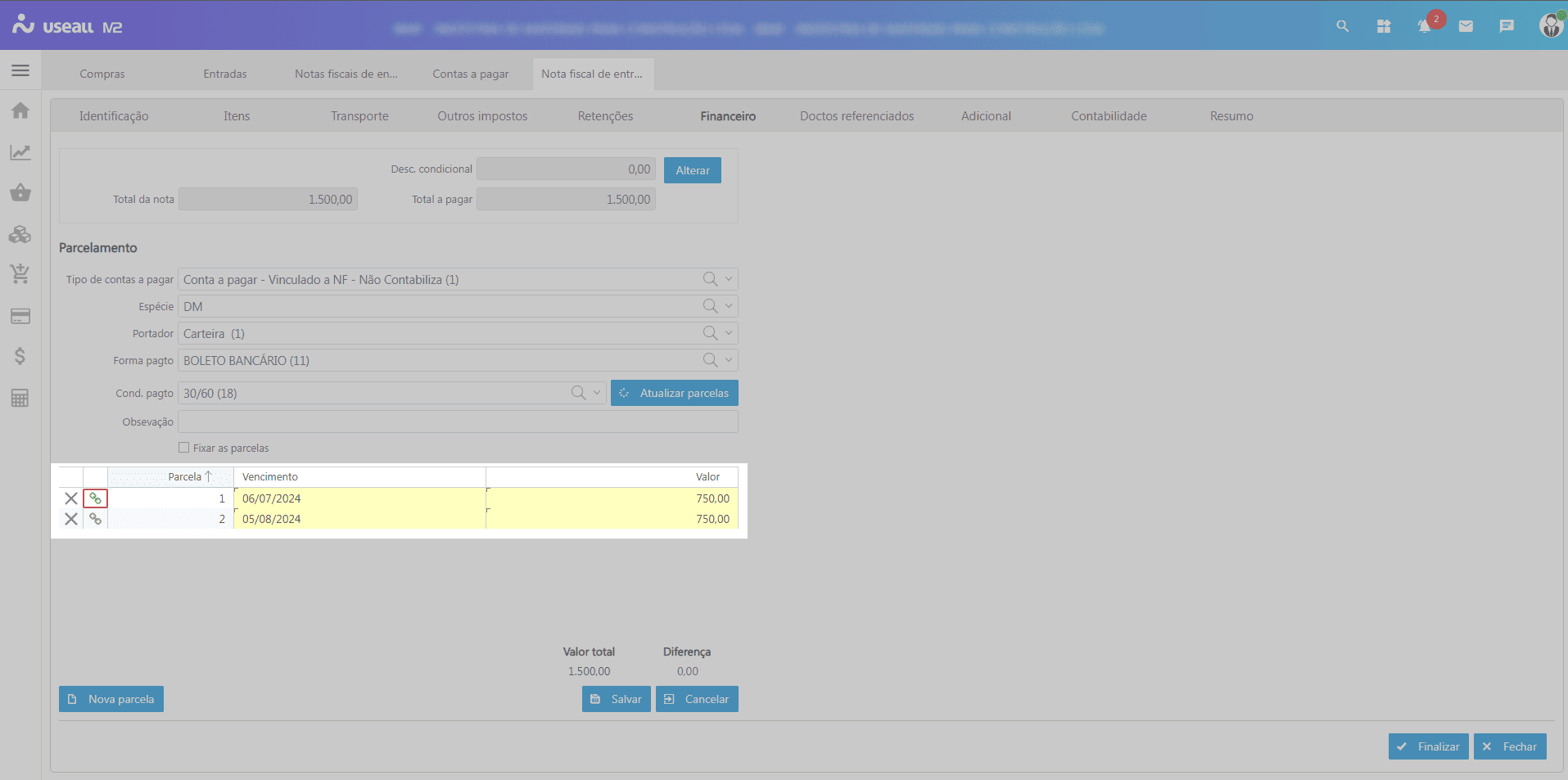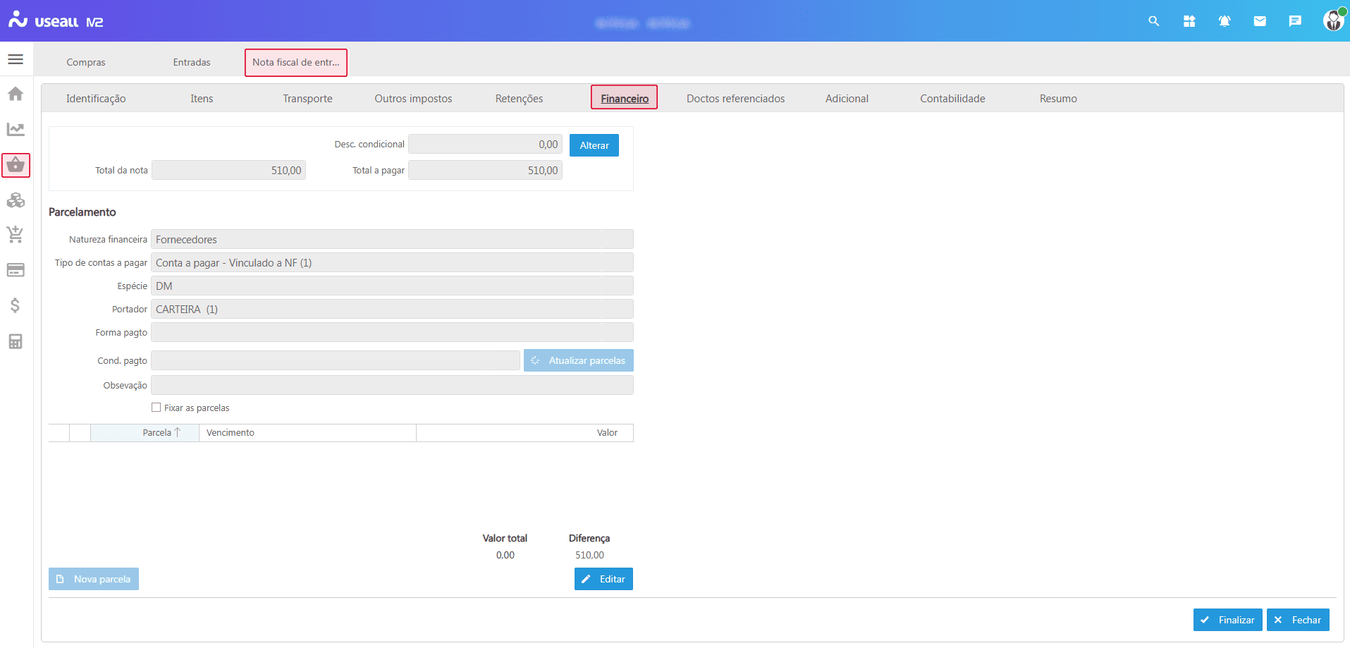 Aba Financeiro: exibe os dados financeiros como total da nota e total a pagar, juntamente com a forma de pagamento e descontos. Nesta etapa pode-se alterar os vencimentos de parcelas, como também alterar a forma de pagamento e condições acordadas;
