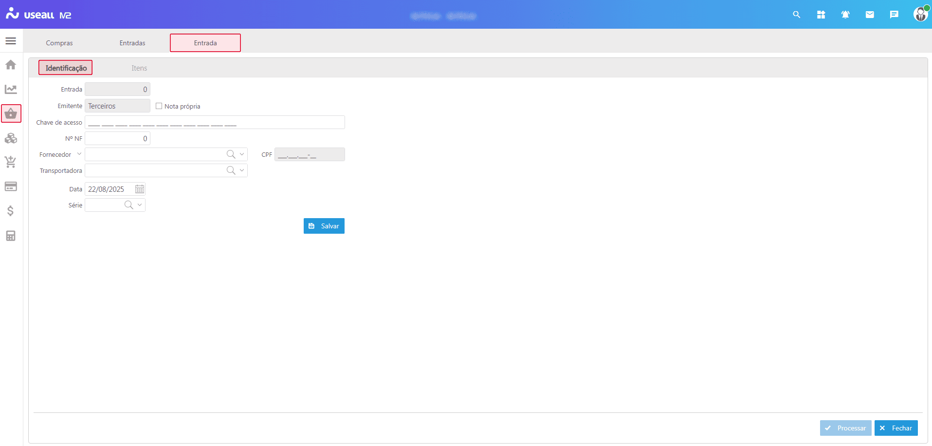 O processo de entrada é feito por etapas, primeiramente é lançado o material e posterior a parte de impostos. Ao clicar no botão Novo > Compra, a tela Lançamento da nota, será exibida com as abas Identificação para informar o cabeçalho da nota e Itens para informar os itens de entrada ou vincular um pedido de compra existente.