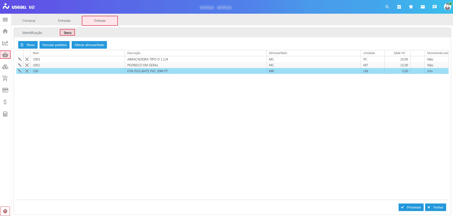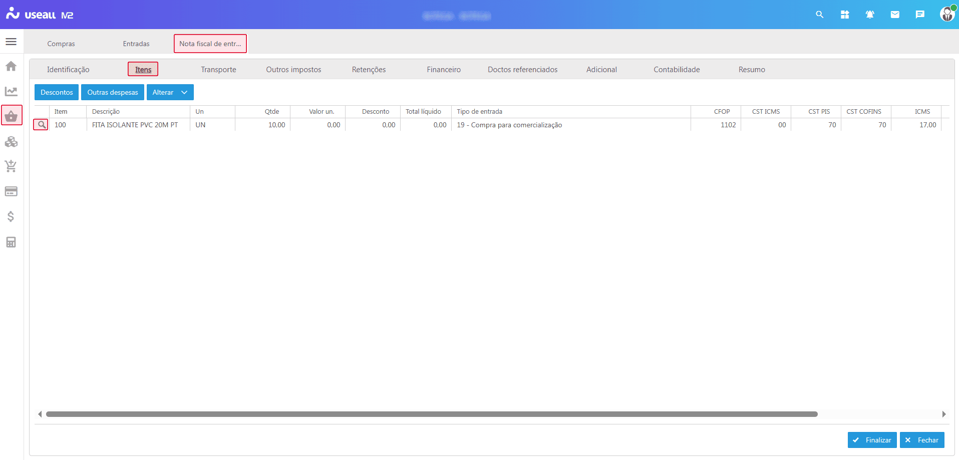 Aba Itens: exibe os dados dos itens da nota fiscal, sendo possível editá-los. Basta clicar no ícone