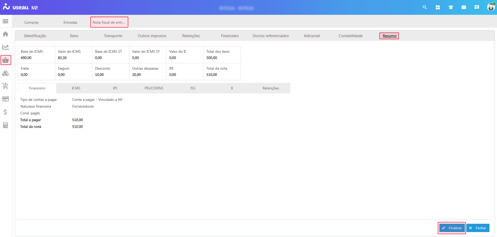 Aba Resumo: nesta aba são apresentados os dados financeiro e impostos da nota para conferência.