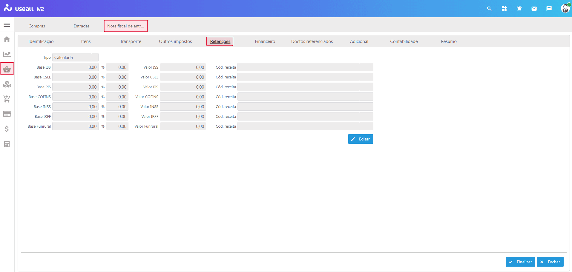 Aba Retenções: nesta aba são exibidos os dados referente a valores de retenções, sendo possível editá-los caso necessário;