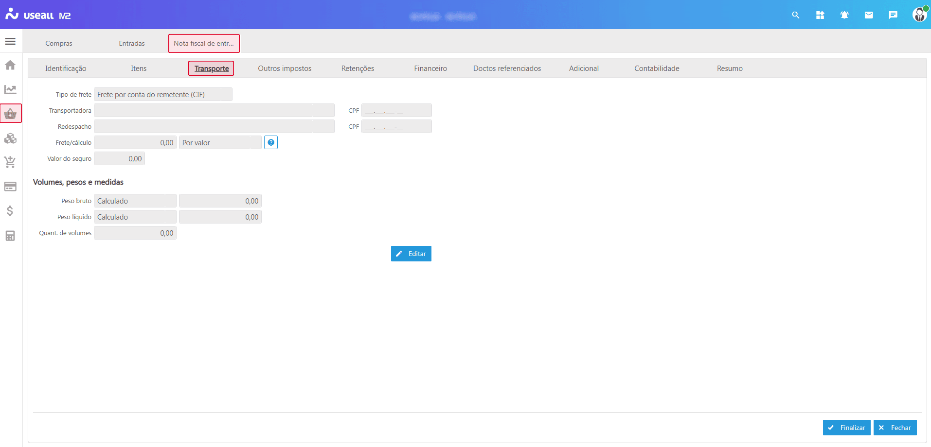 Aba Transporte: nesta aba pode-se editar os dados referente ao transporte, como o tipo de frete, informar transportadora e valores. Os dados de volume e peso do item, também são exibidos nesta aba, calculados conforme a quantidade;