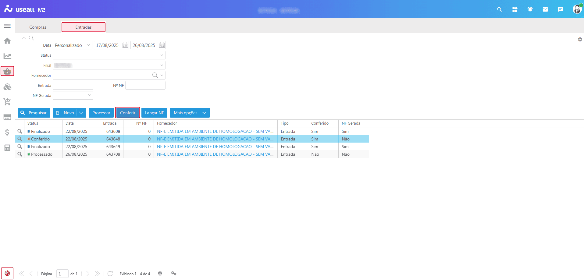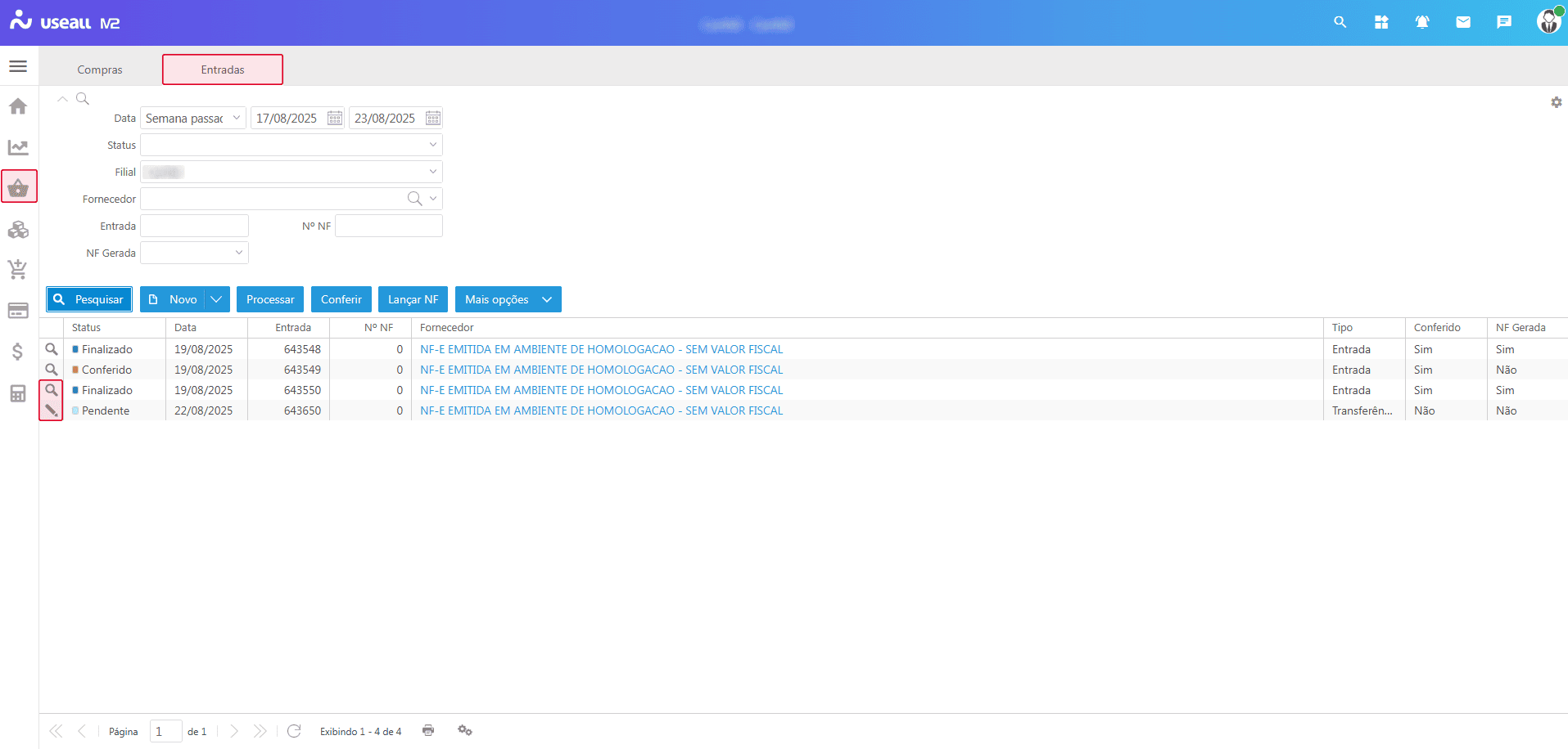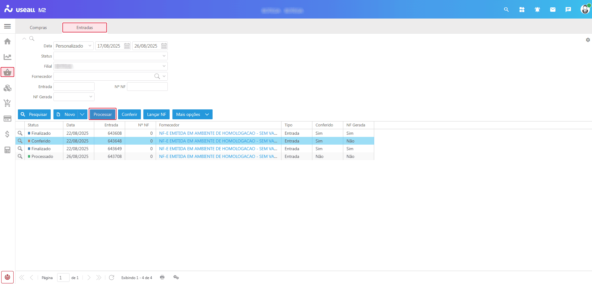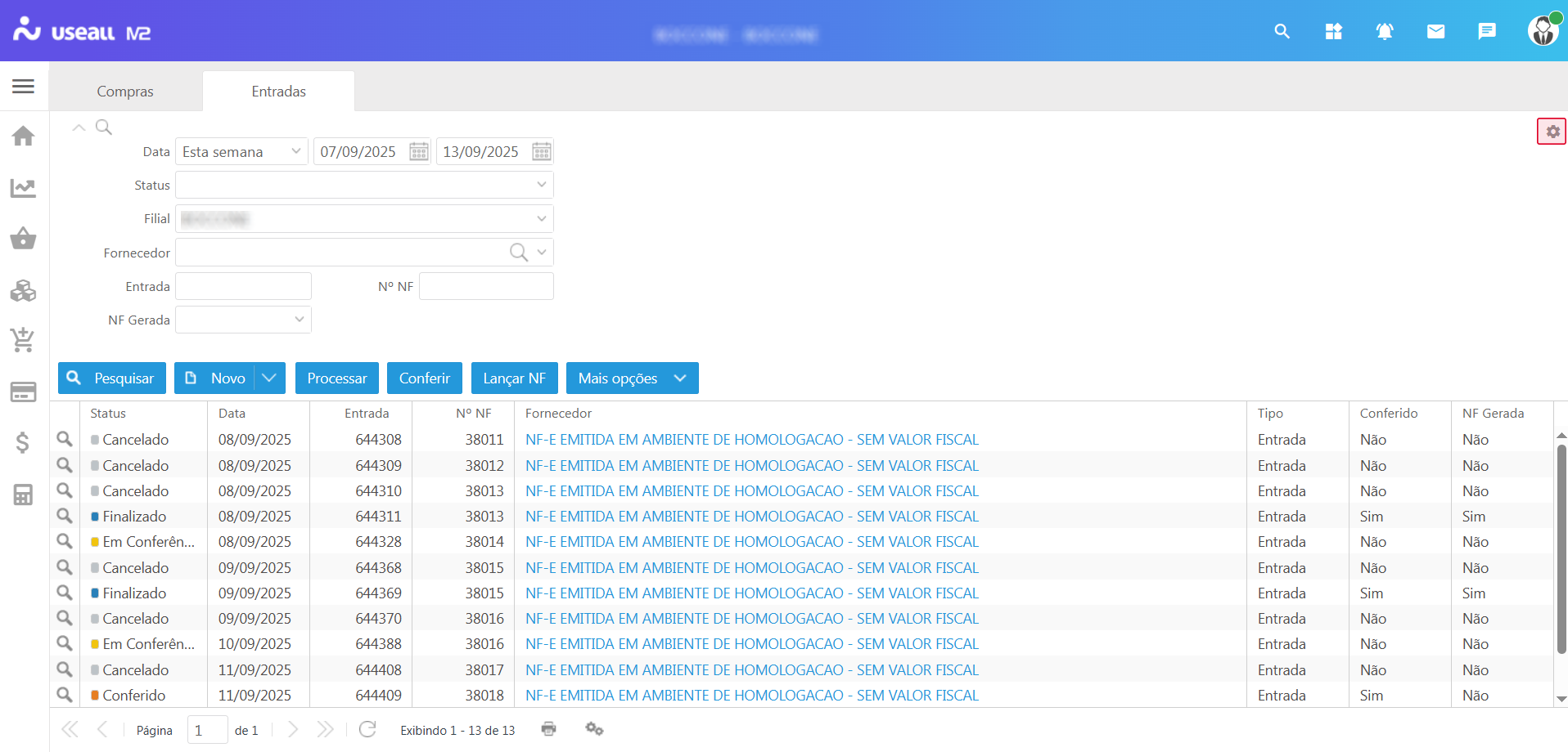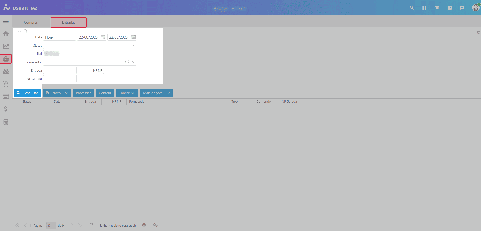 Ao acessar a funcionalidade Entrada são exibidos os filtros e botão pesquisar, botão Novo, botão Processar, botão Conferir, botão Lançar NF, grid de informações e o botão Mais opções.