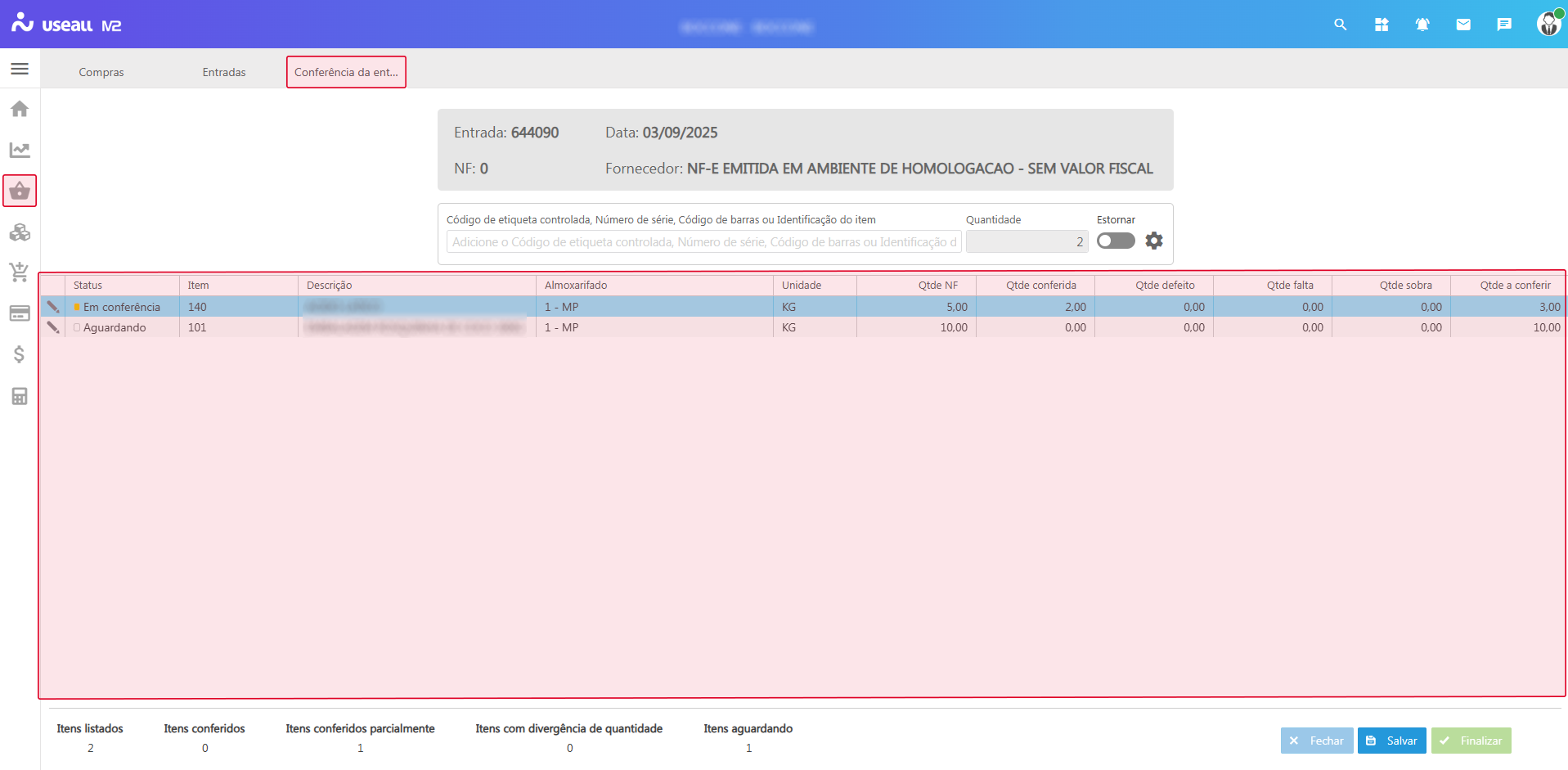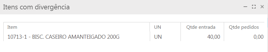- Divergência: indica que a quantidade conferida do registro, está maior que a quantidade da nota, sendo necessário uma ação de ajuste pelo usuário.