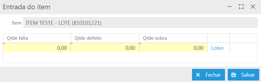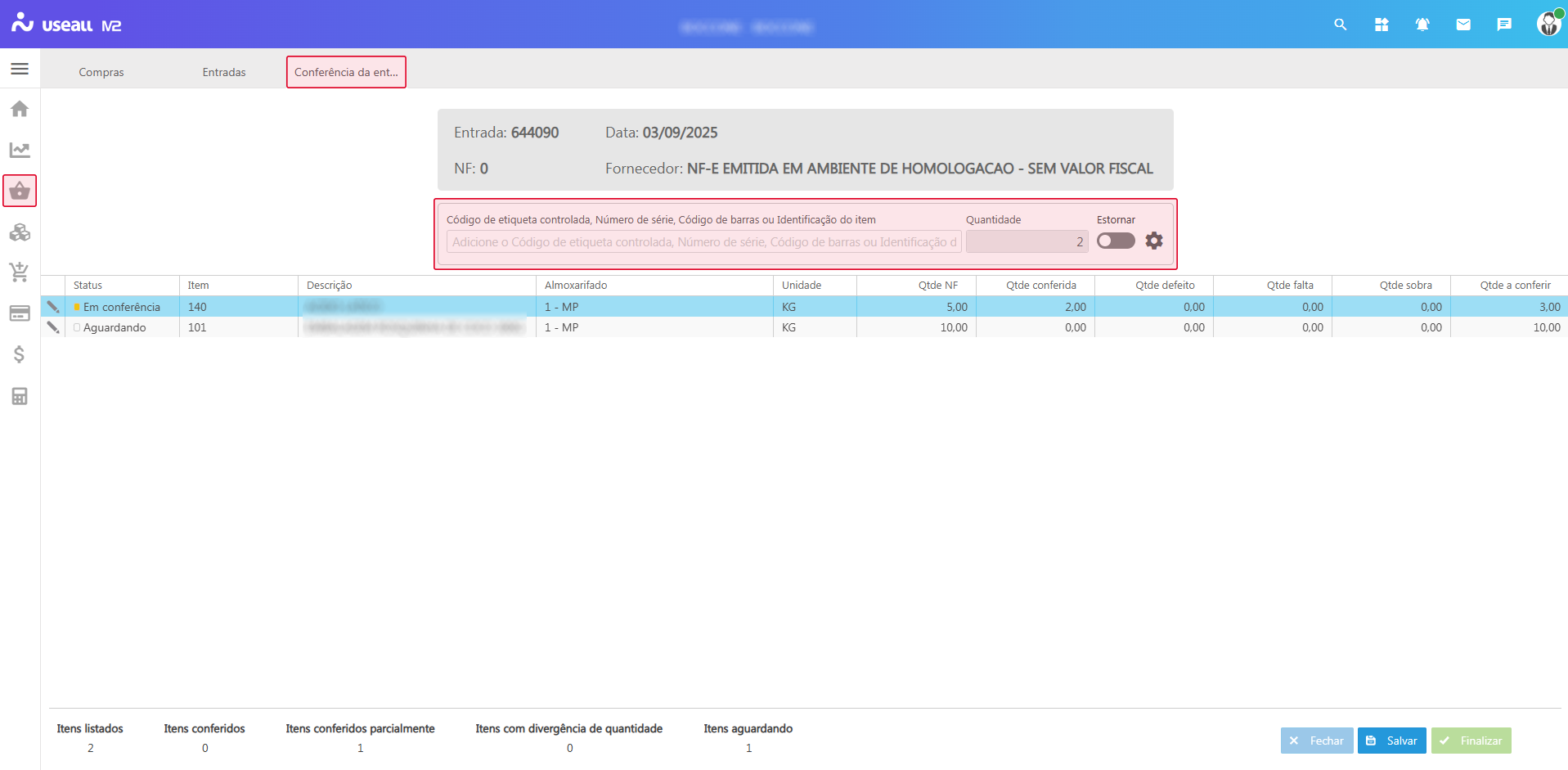 Código de barras do item: permite efetuar a conferência utilizando o código de barras do item manualmente ou através de um leitor de cód. de barras;