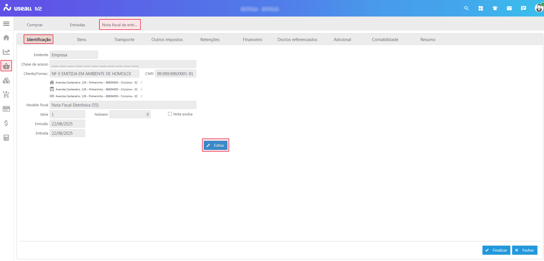 Aba Identificação: exibe os dados de identificação da nota, contendo o "modelo fiscal" e a "série" da nota. É possível efetuar alterações antes de finalizá-la, basta clicar no botão Editar e salvar as devidas alterações;