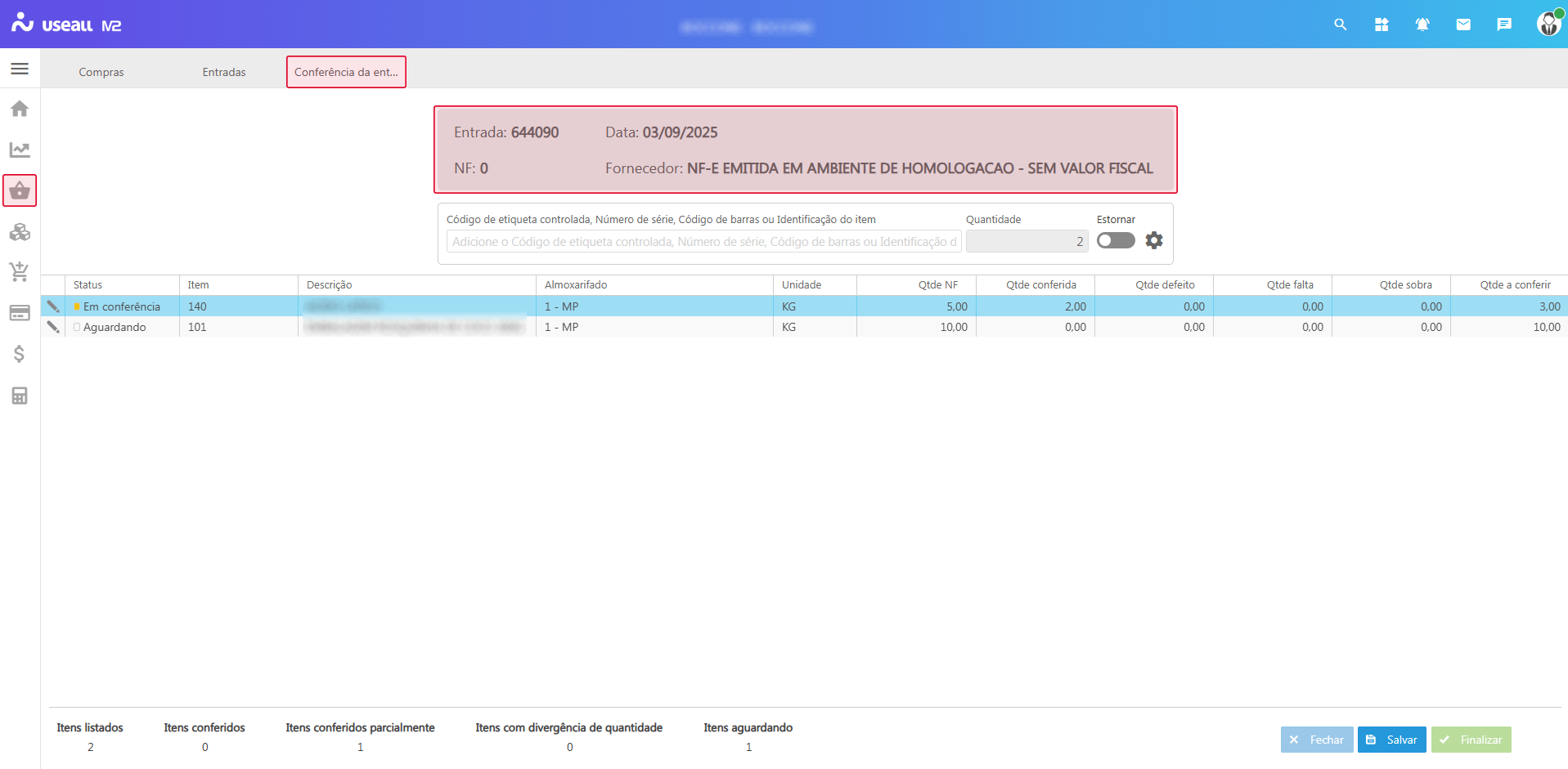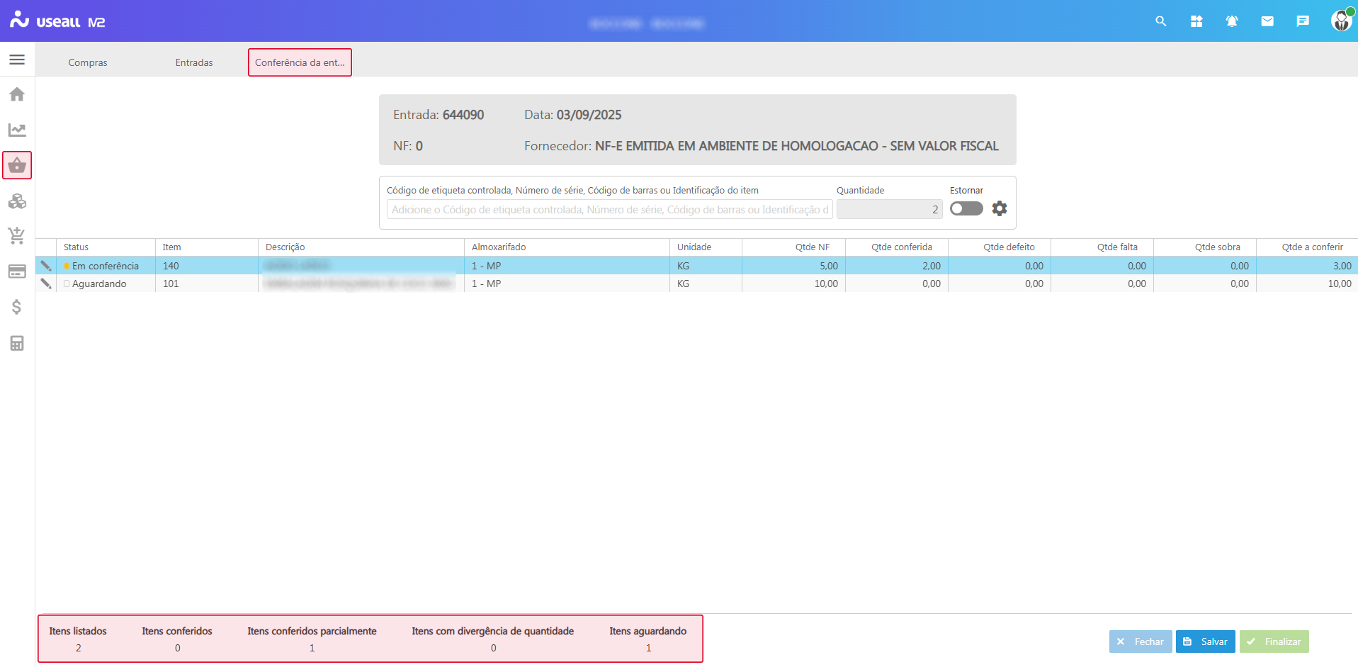 Este quadro apresenta os totalizadores dos registros sendo: Itens listados, Itens conferidos, Itens conferidos parcialmente, Itens com divergência de quantidade, Itens aguardando.