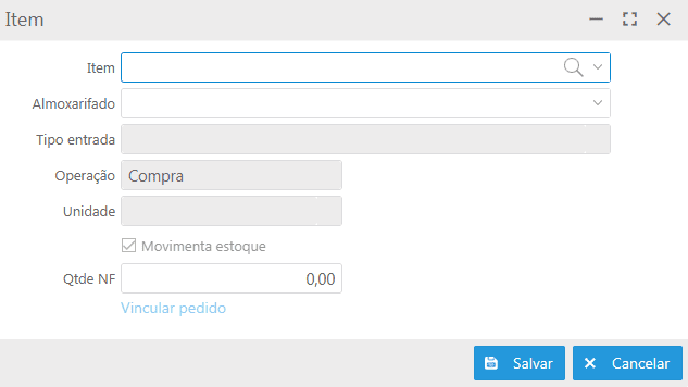 Nessa tela tem-se o campo "Tipo de entrada" e a opção “Movimenta estoque”. O campo tipo de entrada carrega automático conforme o tipo de entrada padrão configurado e a opção movimenta estoque respeita o tipo de entrada padrão, onde informa se movimenta ou não o estoque, deixando a caixa de seleção marcada conforme parametrizado. Essa parametrização possui configuração de permissão de acesso.