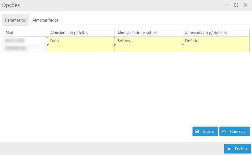 - Deve-se cadastrar os almoxarifados para defeitos, faltas e sobras;