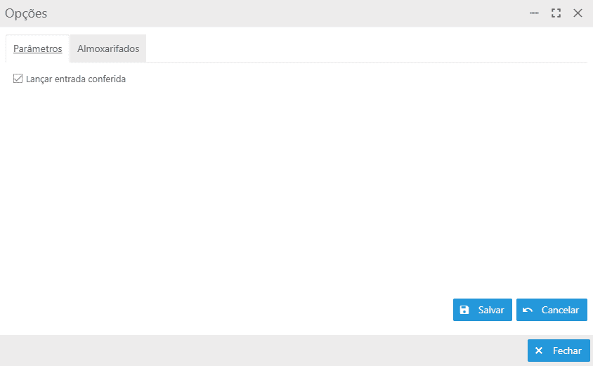 Aba Parâmetros: se a opção Lançar entrada conferida for marcada, o processo de conferência é executado automaticamente. Por padrão, esse parâmetro vem desmarcado;