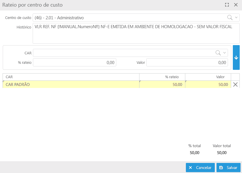 - Caso o Centros de Custos selecionado possua rateios de CAR configurados previamente, através da opção "Configurar rateio de CAR" do cadastro de "Centros de custos", o sistema utilizará esta informação para preencher os campos automaticamente.