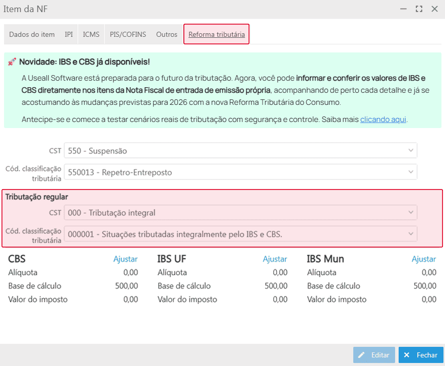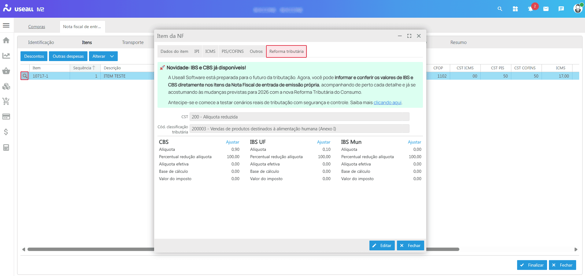 Na tela Itens da NF, disponível na aba Itens, tem-se a nova aba Reforma tributária contendo as informações dos novos tributos: