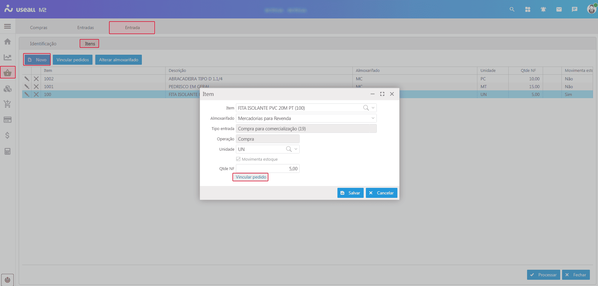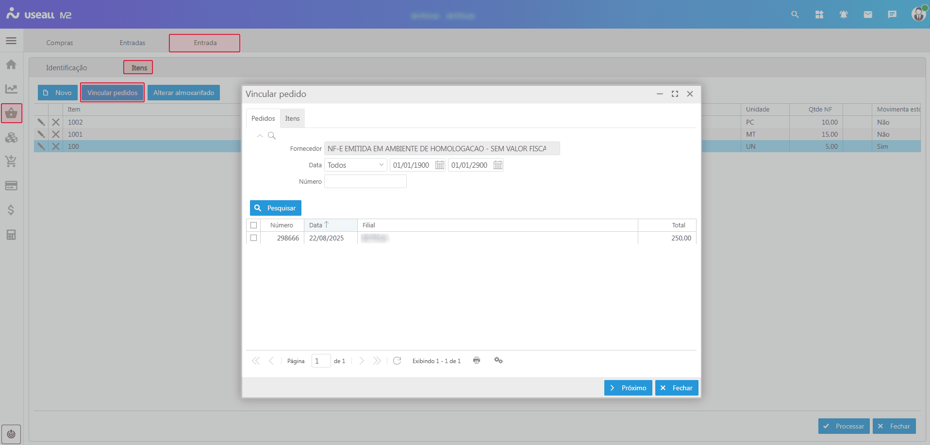 Esta ação serve para vincular pedidos de compra à nota fiscal de entrada, facilitando o processo, sendo possível efetuar a vinculação de duas formas: