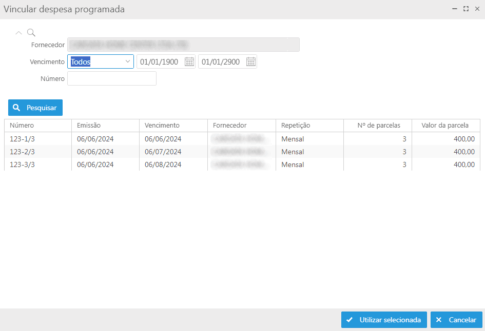 Despesas programadas: este é um recurso disponível no módulo Pagar > Mais opções, servindo como um assistente para cadastrar despesas, sendo possível vinculá-las ao contas a pagar quando for registrá-las. Na aba Financeiro, também é possível utilizar esse recurso através do ícone , ao clicar, abrirá a tela Vincular despesa programada, basta selecionar o registro desejado para o vínculo, apresentando posteriormente o ícone