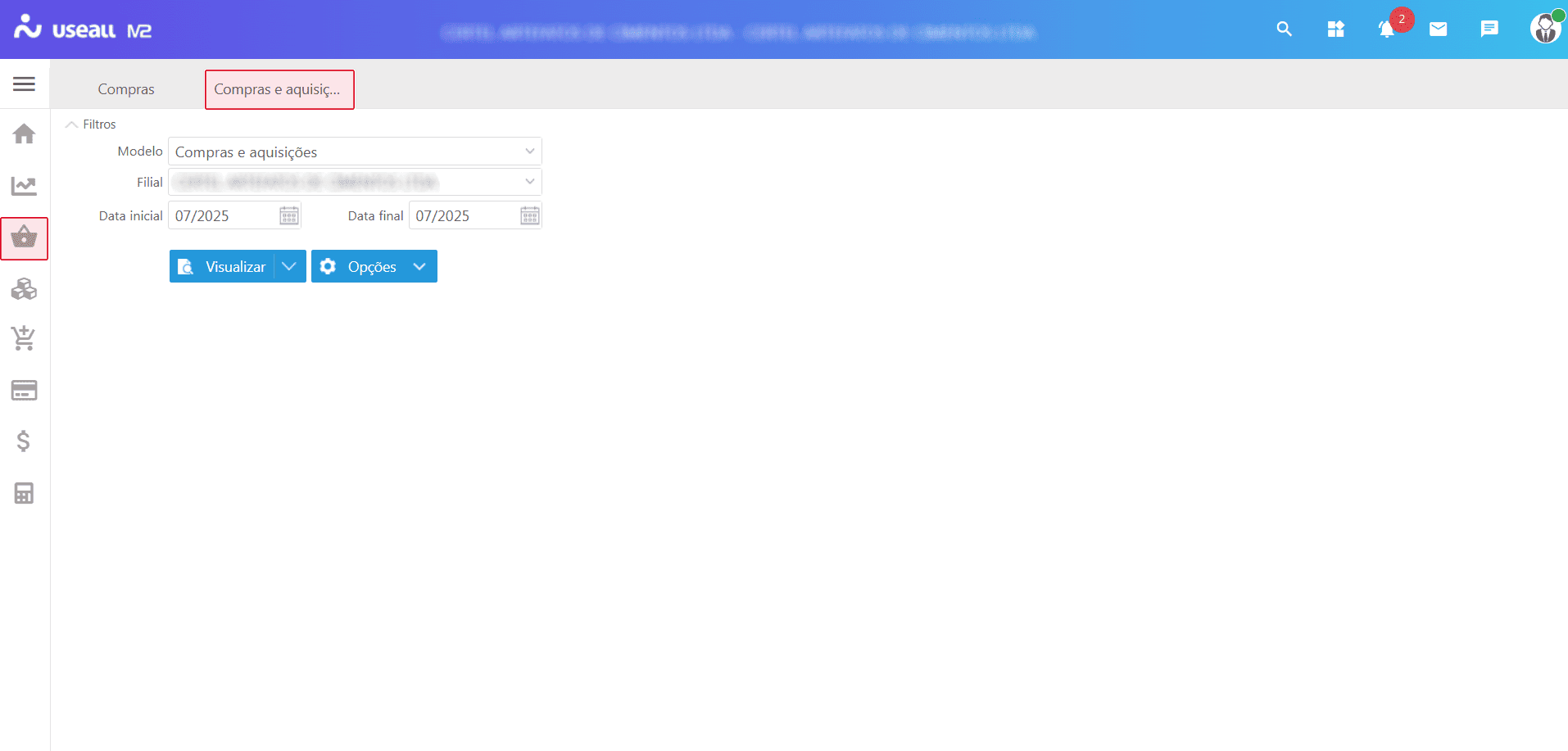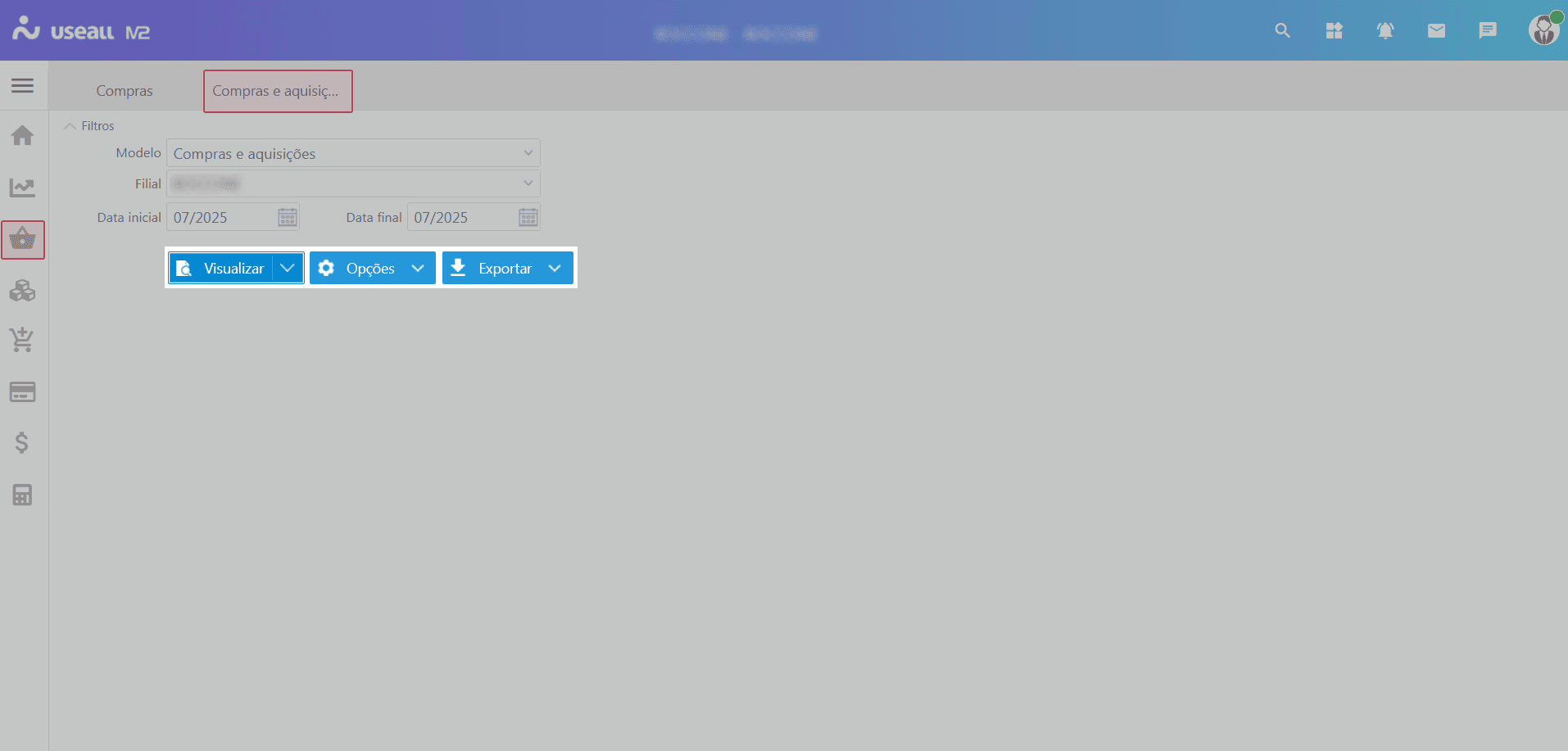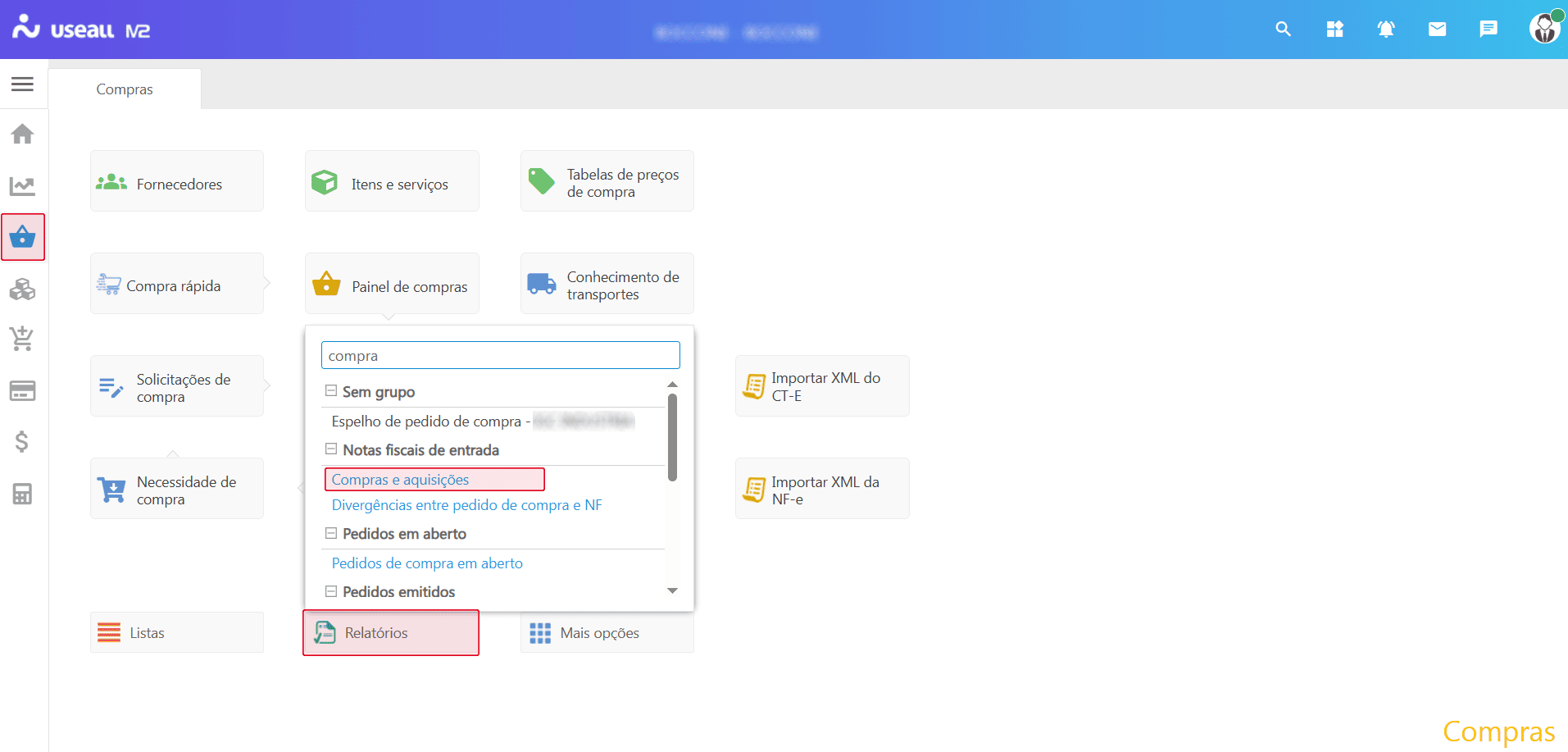 Acesso disponível no módulo Compras > Relatórios > Compras e aquisições.