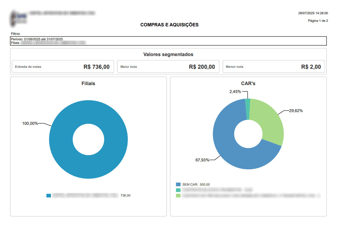 O relatório Compras e aquisições tem como objetivo disponibilizar, de forma visual e de fácil compreensão, informações sobre as compras e aquisições de mercadorias realizadas em um determinado período. Os dados são apresentados em formato gráfico, facilitando a análise por parte de gerentes e gestores, com foco na avaliação dos resultados obtidos no período.