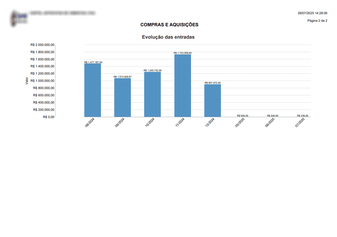 A segunda página do relatório apresenta o gráfico em barras de evolução das entradas, expondo os valores das compras realizadas nos últimos 12 meses a partir da data final do período informada no filtro.