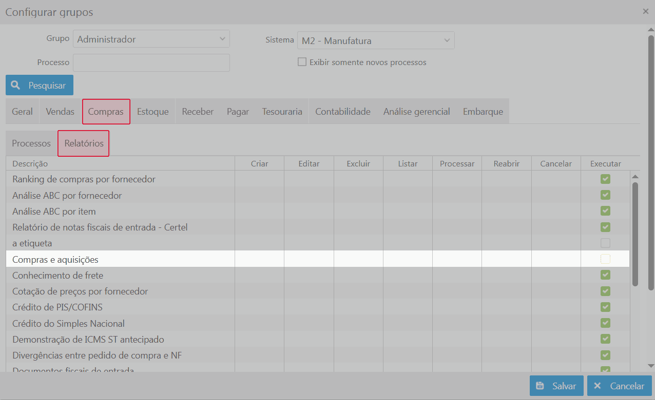 Logado no sistema USEALL deve-se acessar o Módulo Central, opção Usuários¹, selecionar o usuário que terá a permissão, clicar no botão Mais opções, opção Permissões de sistemas. Deve-se clicar na opção configurar do sistema M2-Manufatura, em seguida, acessar o módulo Compras, aba Relatórios, localizar e selecionar a permissão do relatório Compras e aquisições.