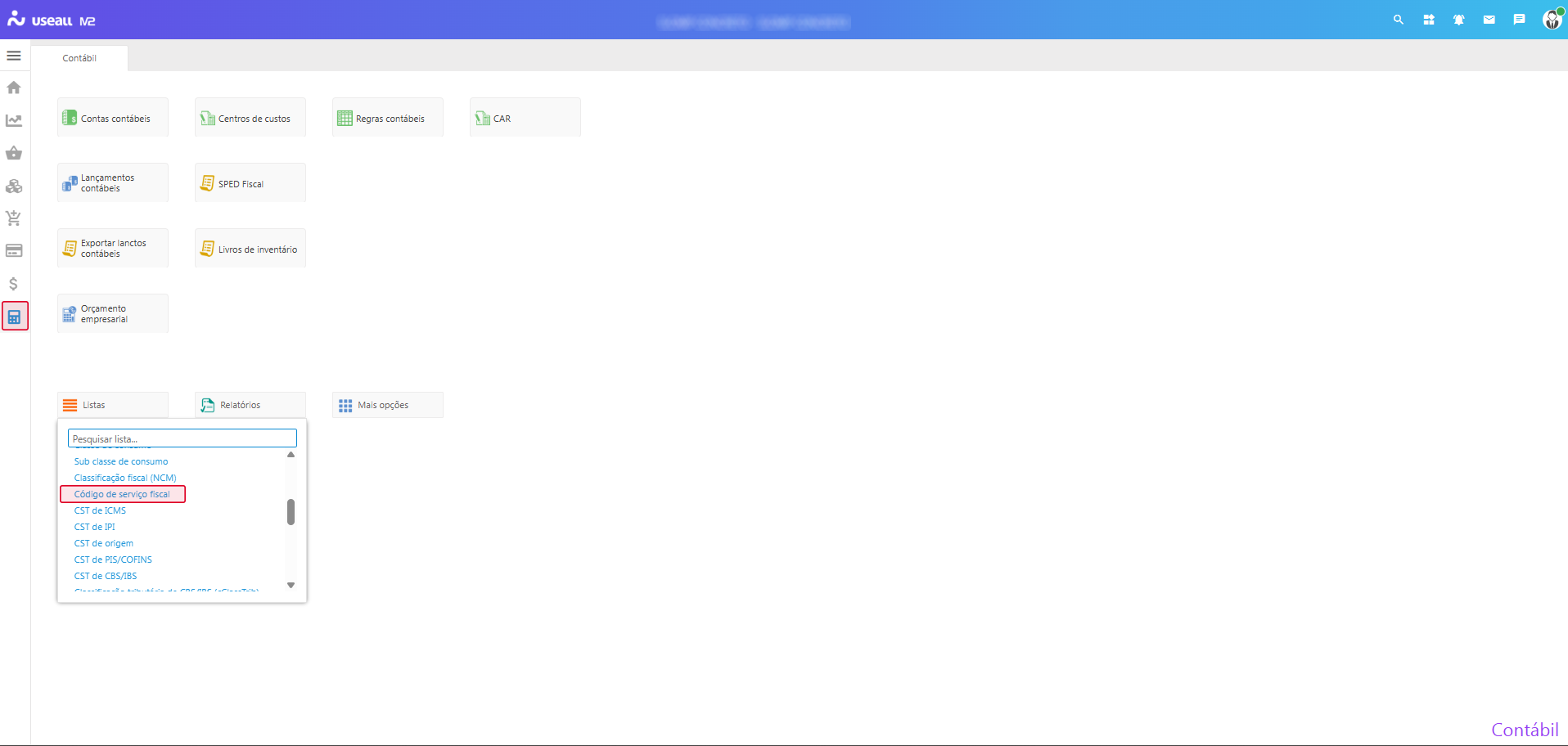 O acesso está disponível no Módulo Contábil > Listas > Código de serviço fiscal.