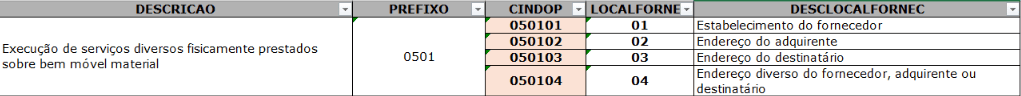 O código indicador da operação (cIndOp) possui um prefixo e um sufixo, sendo que o sufixo define o local do fornecimento do serviço enquanto o prefixo define a característica do serviço que está sendo executado.