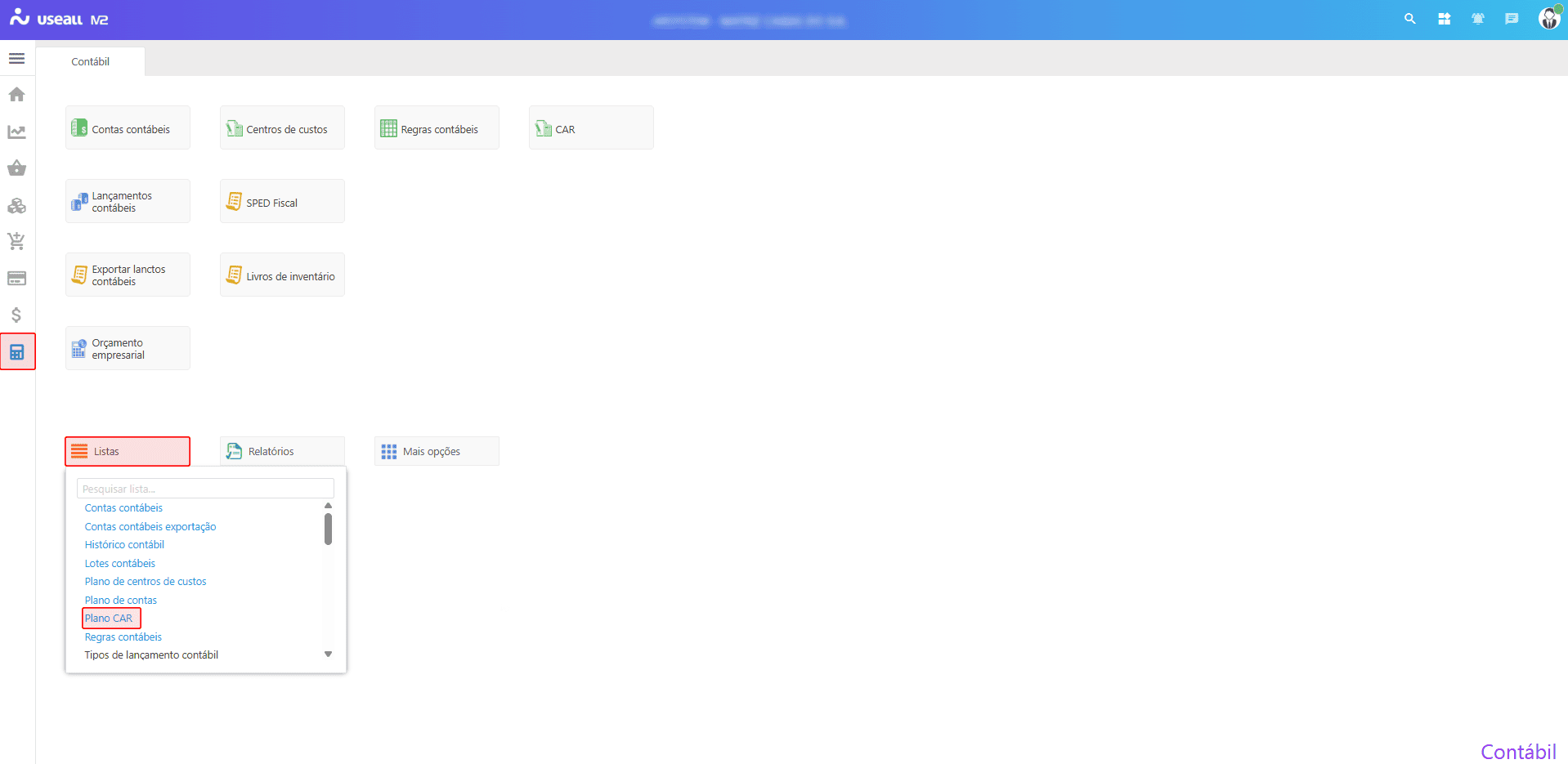 O acesso está disponível em Módulo Contábil > Listas > Plano CAR.