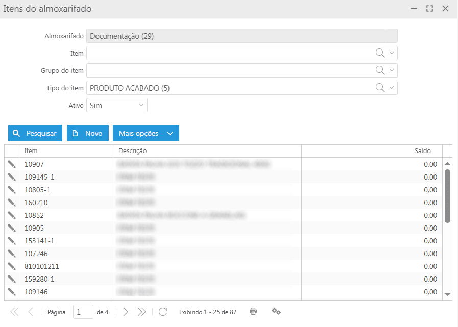 Somente almoxarifados de matéria-prima e produto acabado são considerados na consulta de saldo na lista de itens.