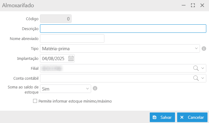 Ao clicar no botão Novo será exibida a tela Almoxarifado apresentando os seguintes campos: