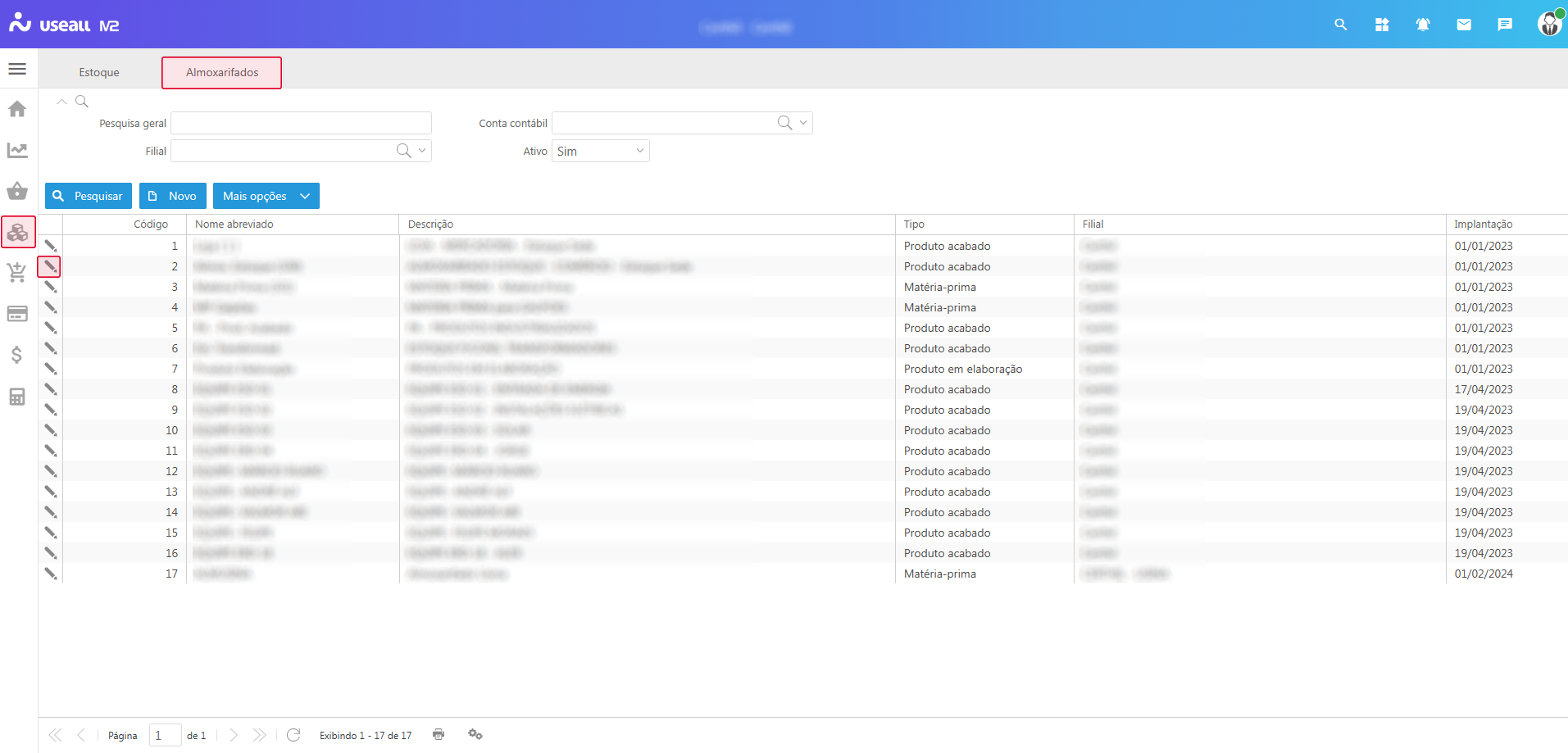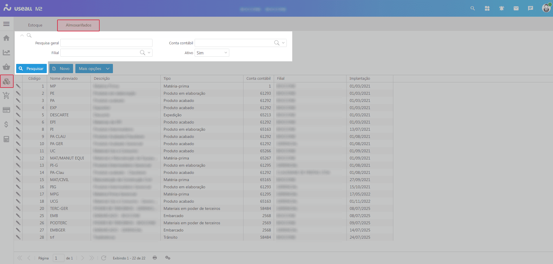Ao acessar a funcionalidade Almoxarifados são exibidos os filtros e botão pesquisar, botão Novo, grid de informações e o botão Mais opções.