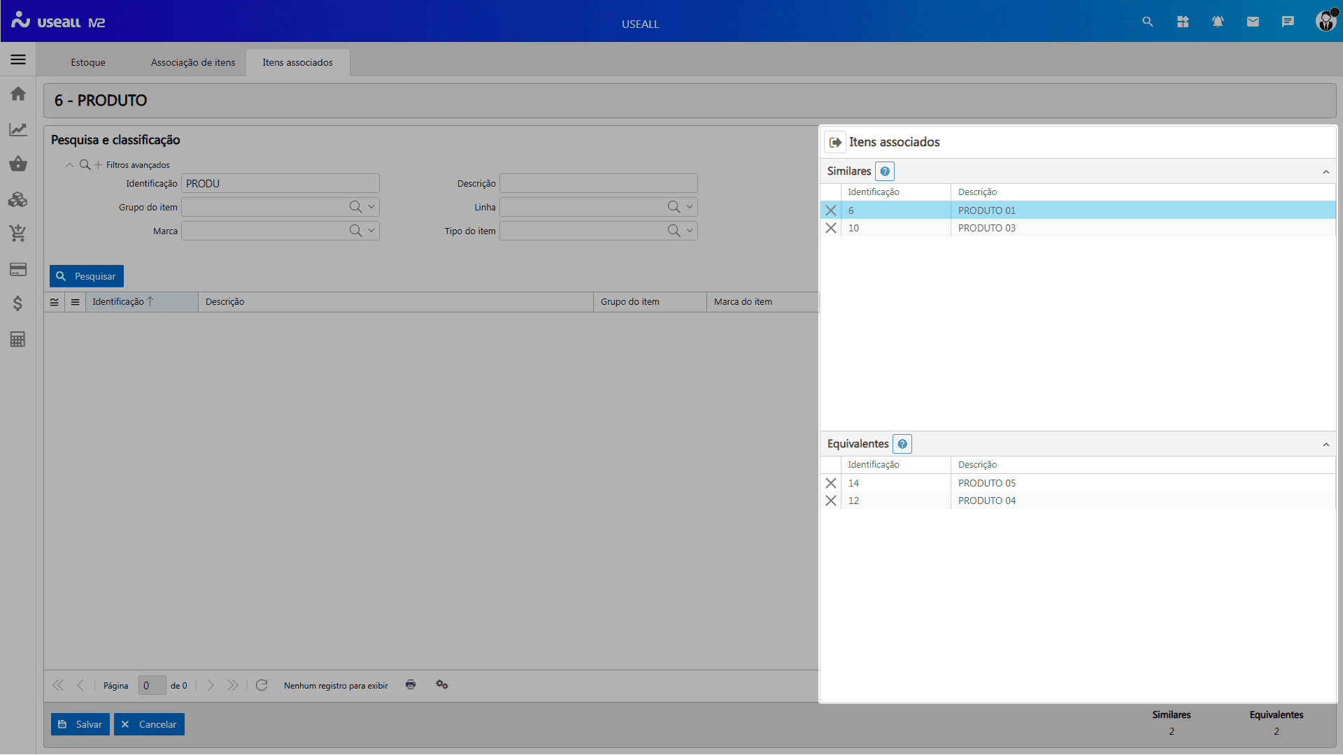 No rodapé é apresentado os botões Salvar e Cancelar, e o totalizador dos itens dos quadros Itens associados e Equivalentes.