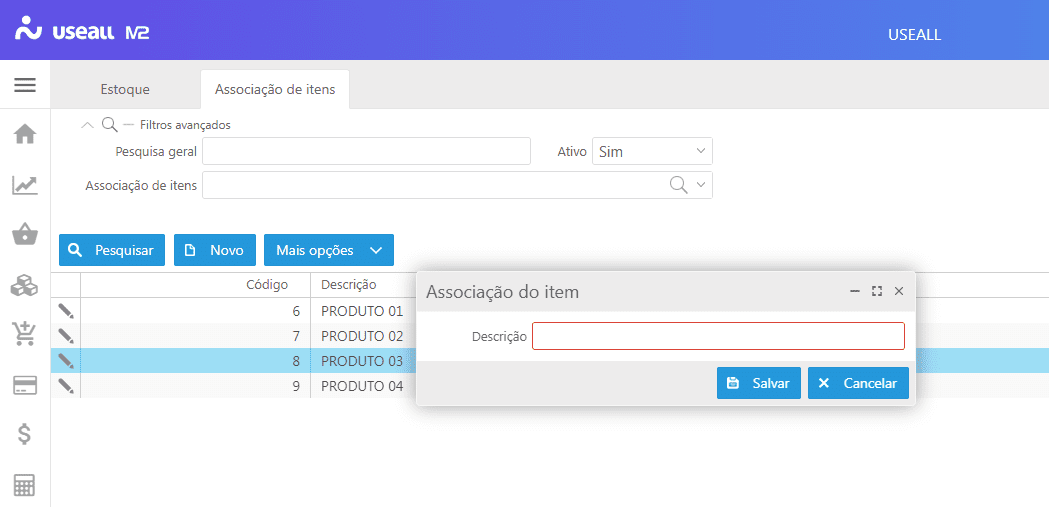 Para adicionar uma associação de itens basta clicar no botão Novo, onde exibirá uma tela solicitando para informar uma descrição, ao Salvar será aberta a tela Itens associados.