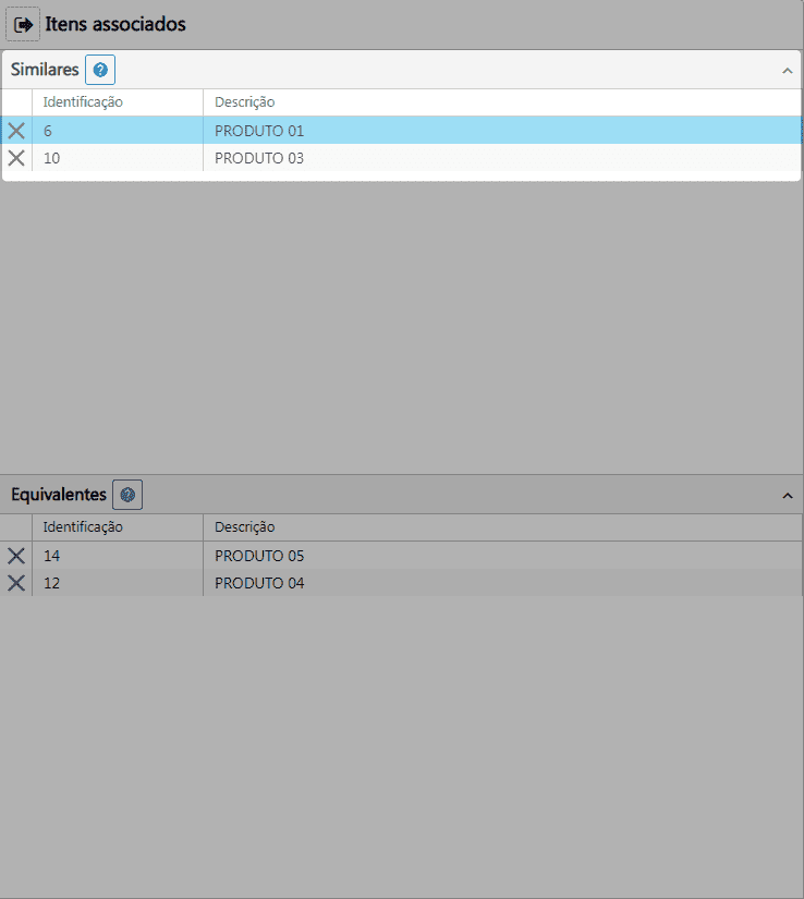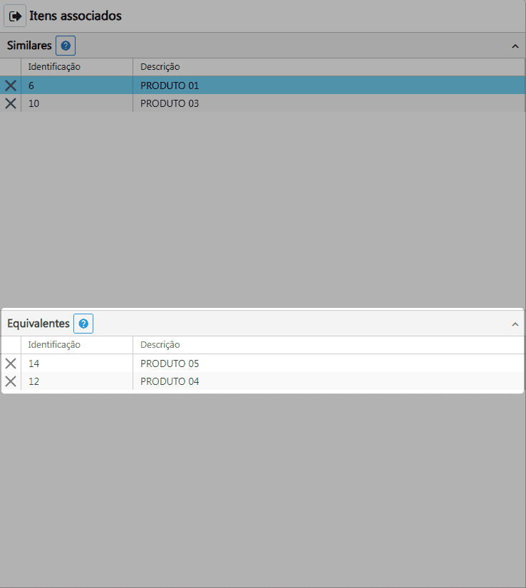 Para remover o item associado, no Quadro - Similares ou no Quadro - Equivalentes basta clicar no X que fica no item.